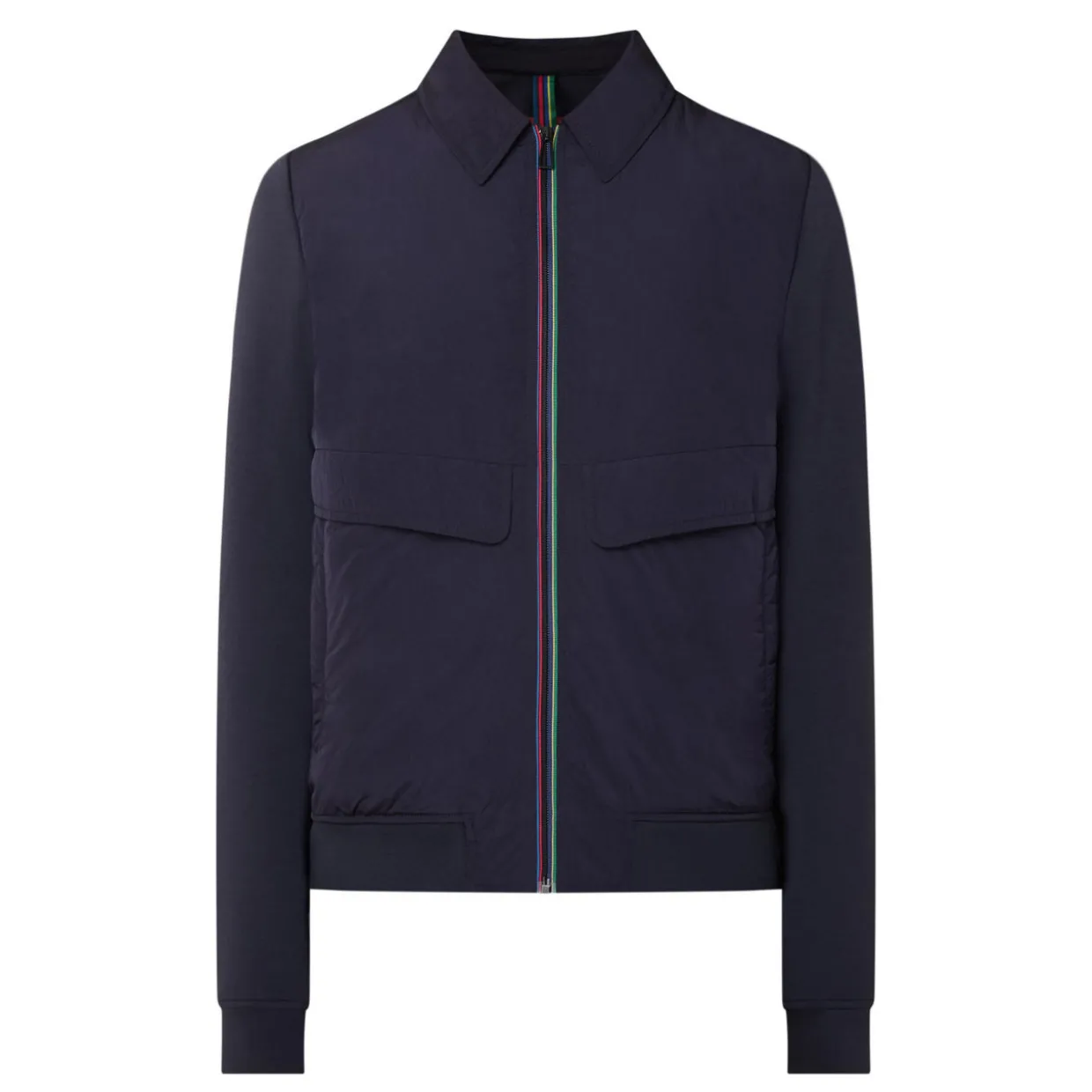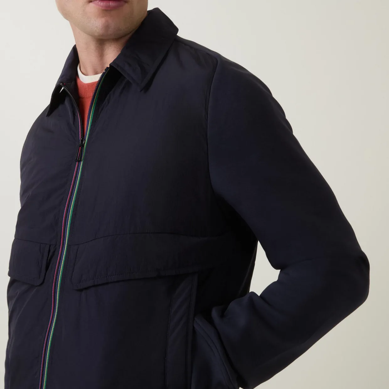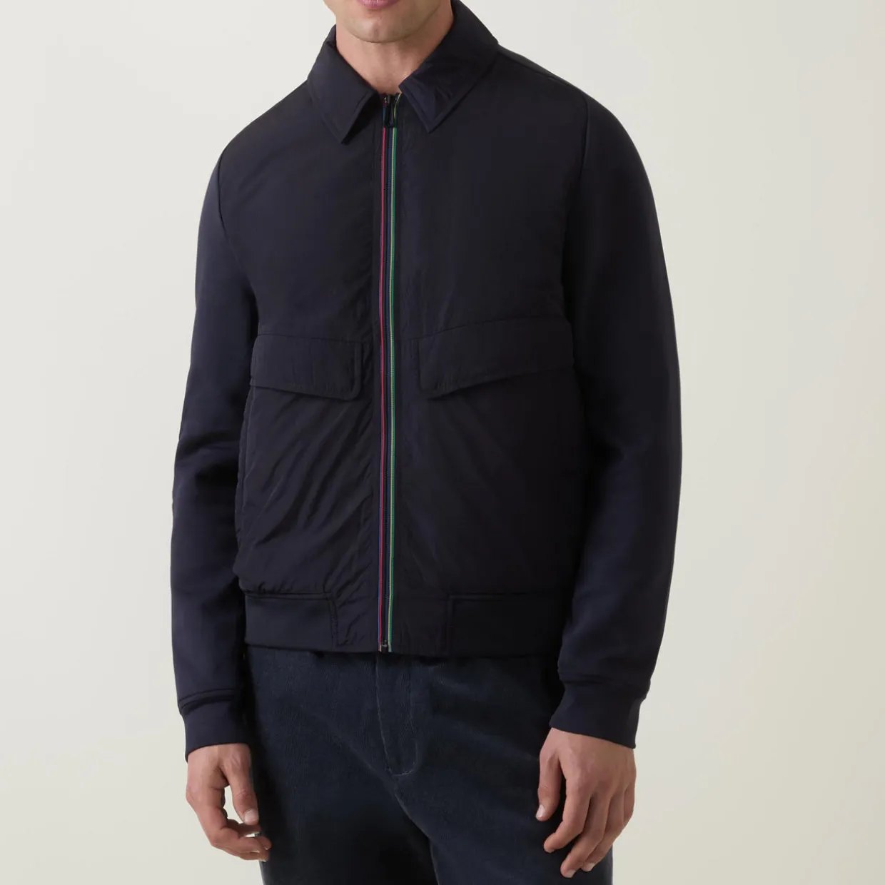 - Collared neckline, zip fastening, ribbed trims, side entry pockets, Sports Stripe detail, wadded front, DWR showerproof finish