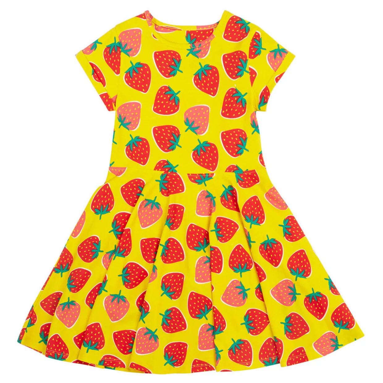 - Strawberry patch print, twirl-friendly full skirt, knitted, short sleeves, round neckline