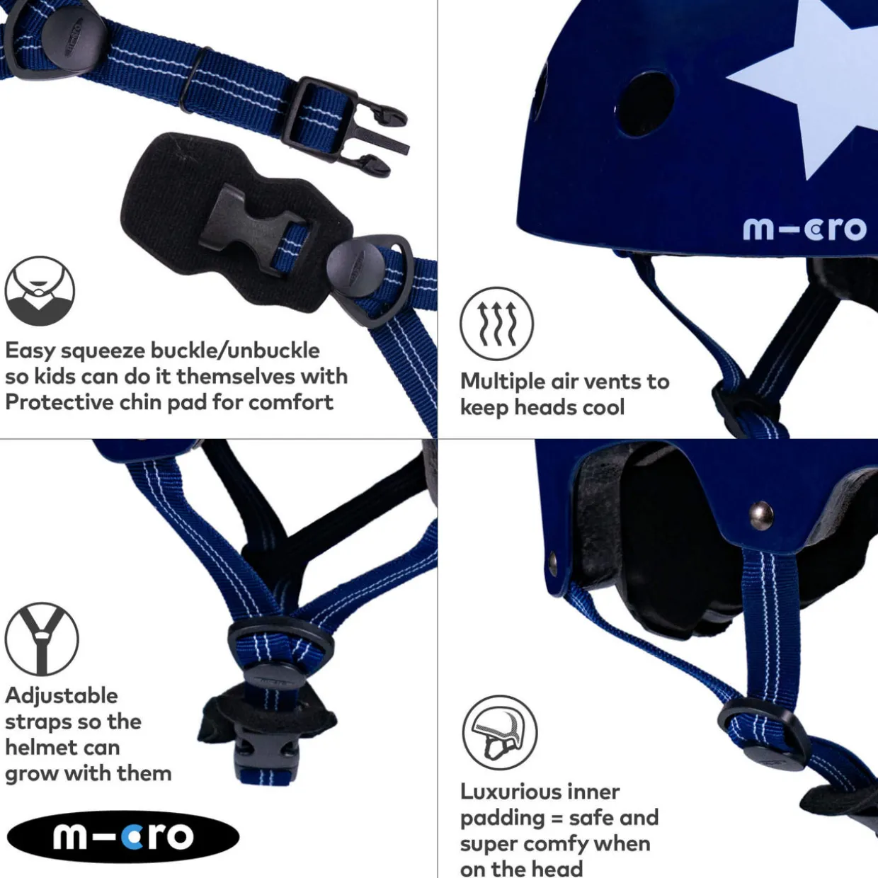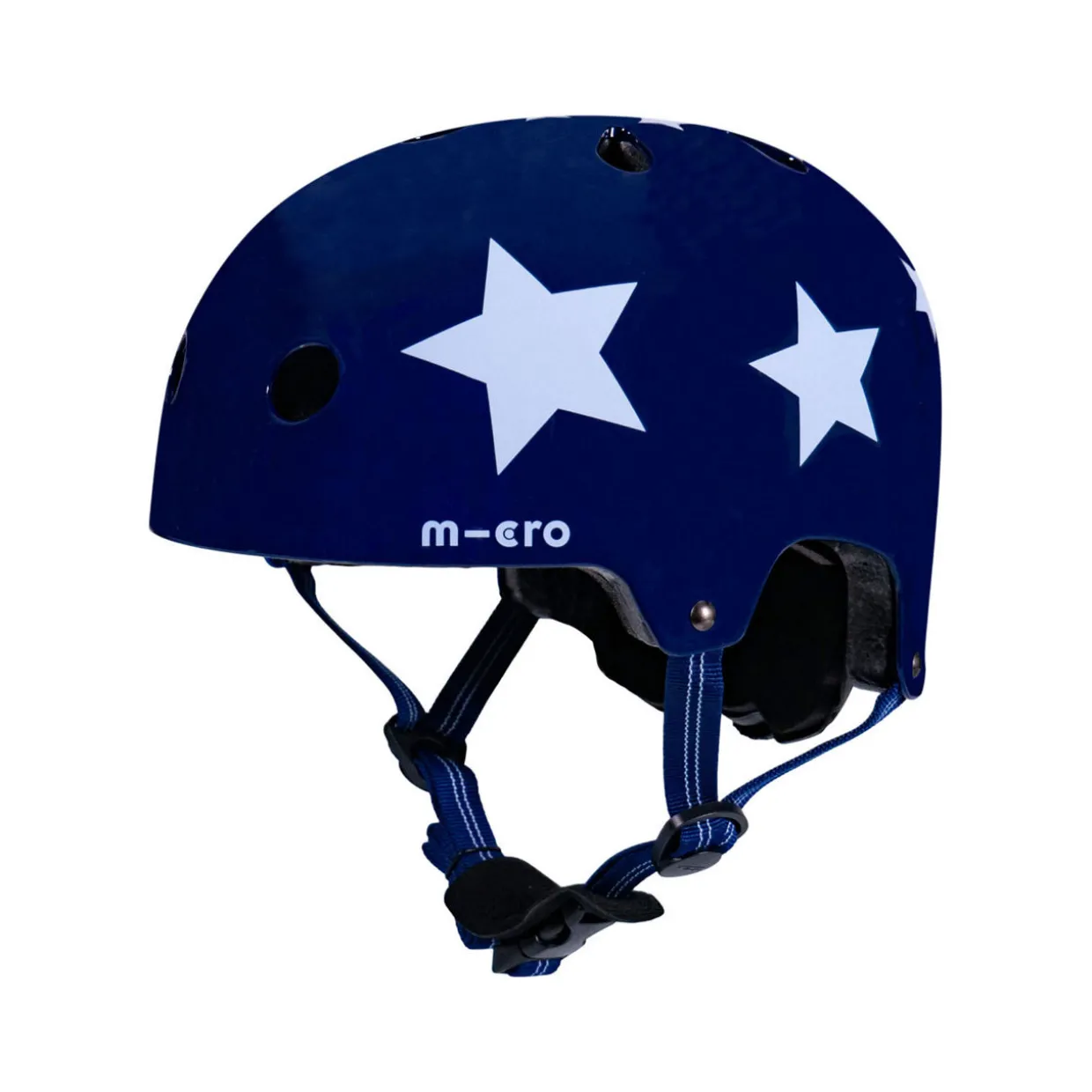 - Solid ABS construction for impact protection, rear light for added safety, protective chin pad, size adjustable fit system for best fit, padding for comfort, star print, air vents, reflective logo