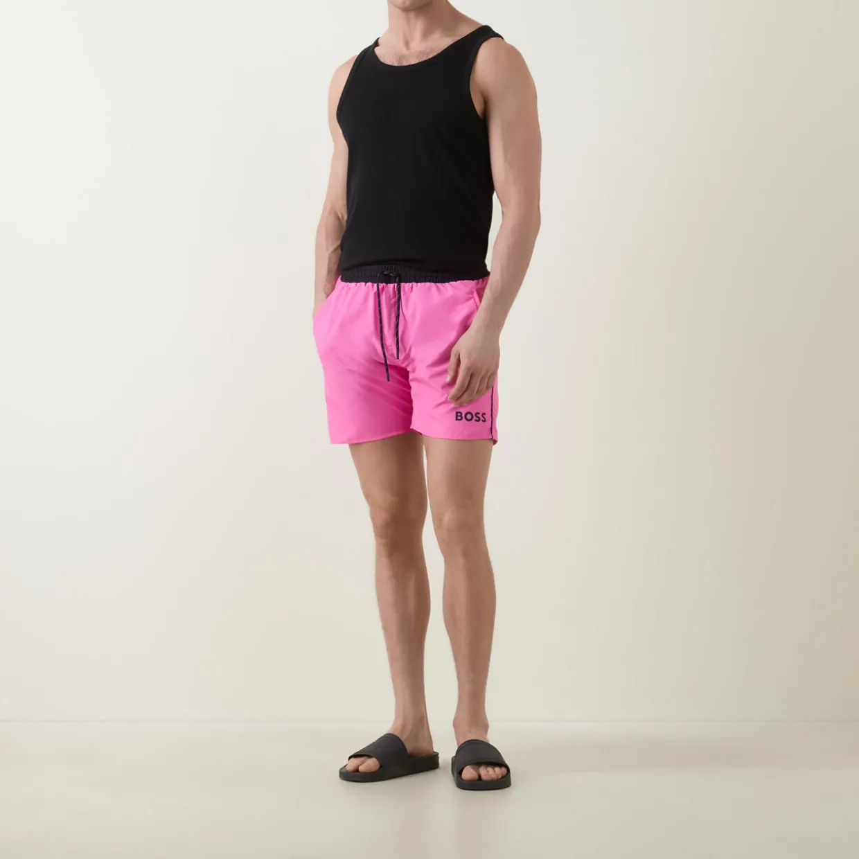 - Quick-drying fabric, elasticated waist, side pockets, logo detail, back pocket, side stripes