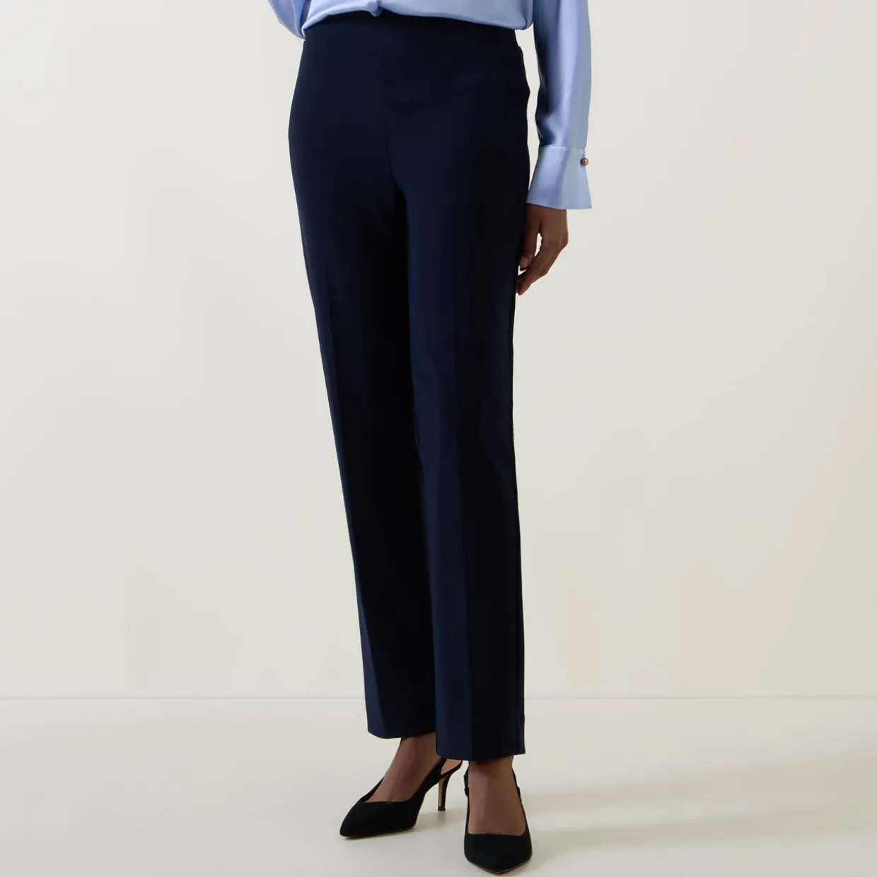 - High-rise, straight-leg, full-length, wide elasticated waistband, clean hems, pull-on style, smooth finish