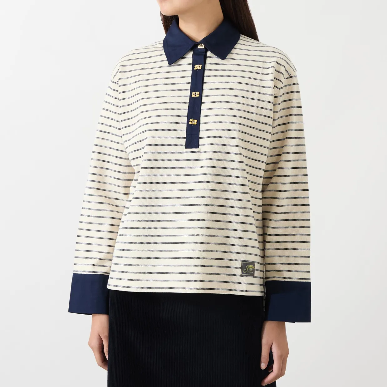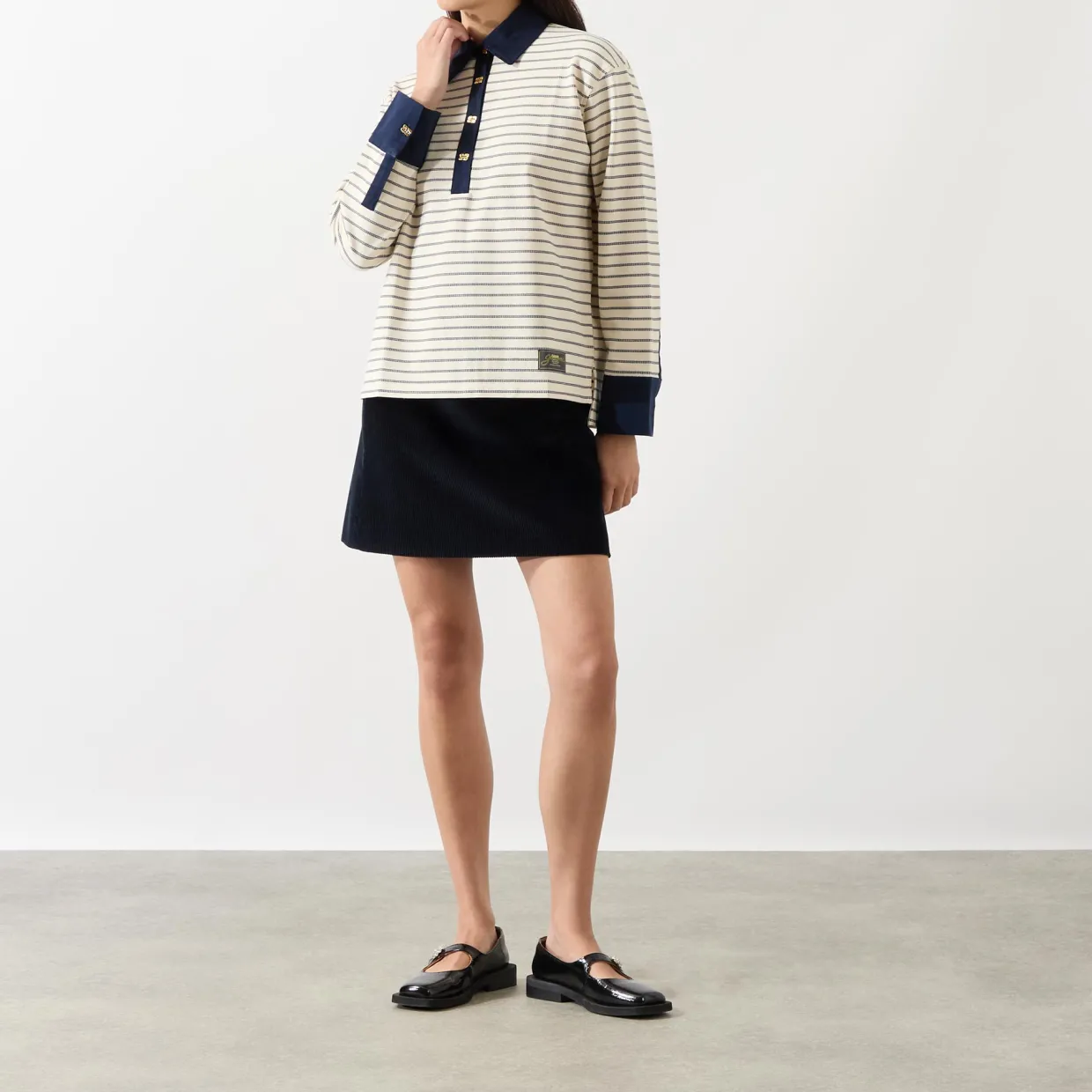 - Flat collar, logo button fastening, straight hemline, stripe pattern, contrast trims, branded badge at side, buttoned cuffs