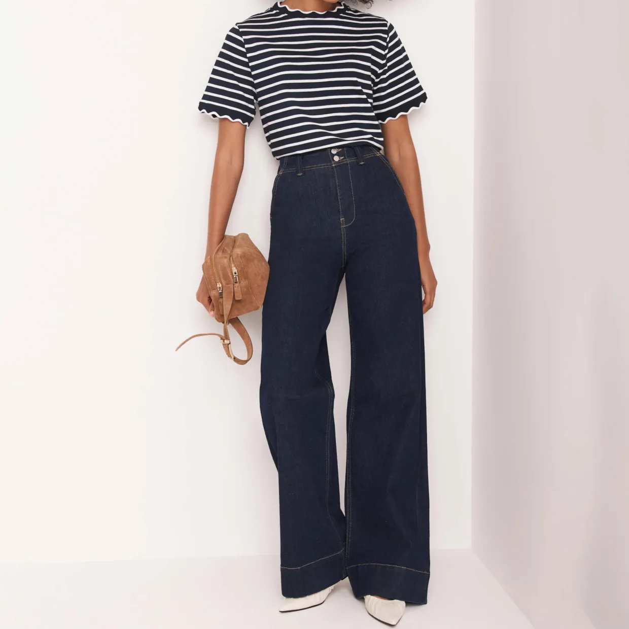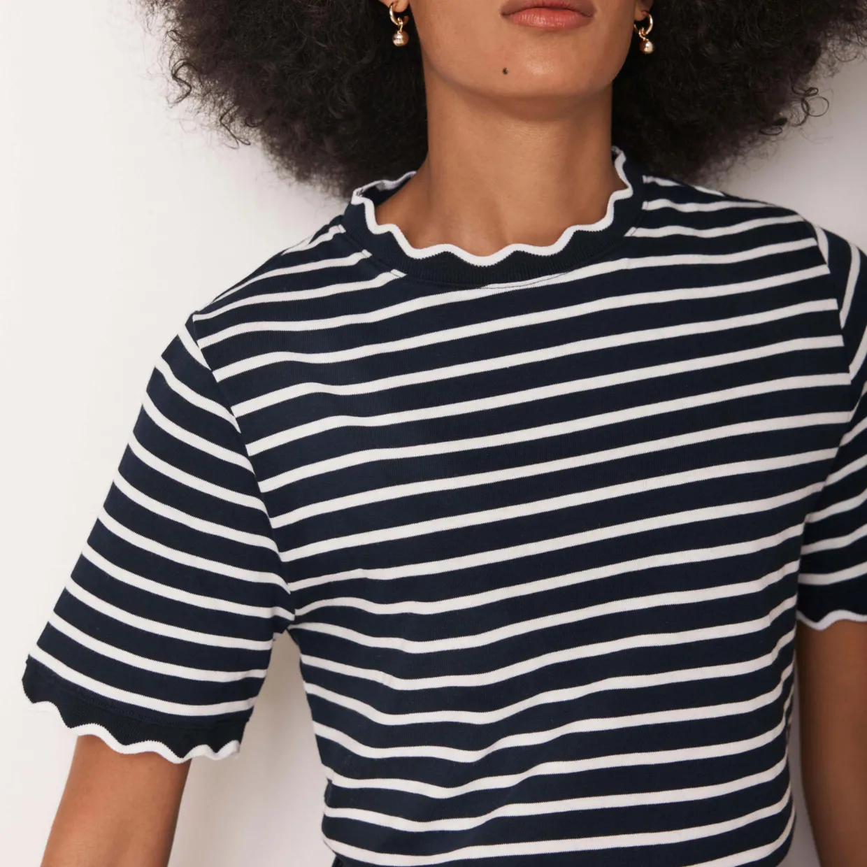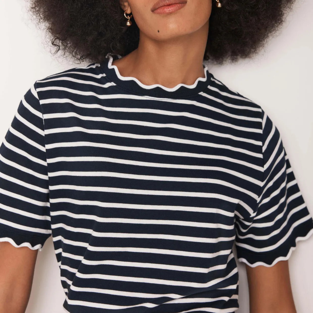 - Striped, crew neckline, short sleeves, scallop trims