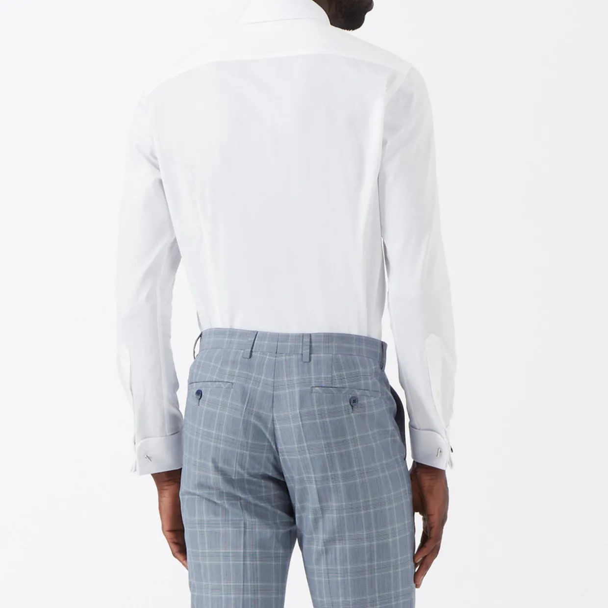 - Pointed collar, stud buttons, long sleeves, curved hemline.