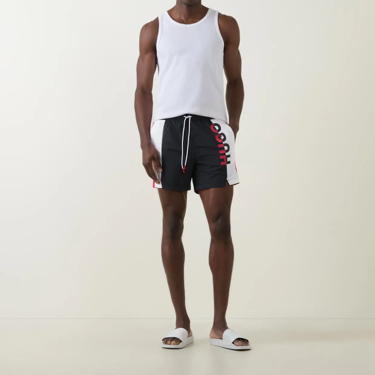 - Mid-rise, straight leg, elasticated waistband, adjustable drawstring fastening, two side pockets, clean hems, colour-block design, vertical logo detail
