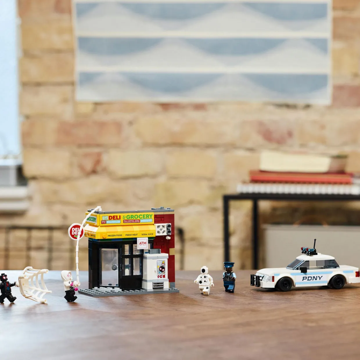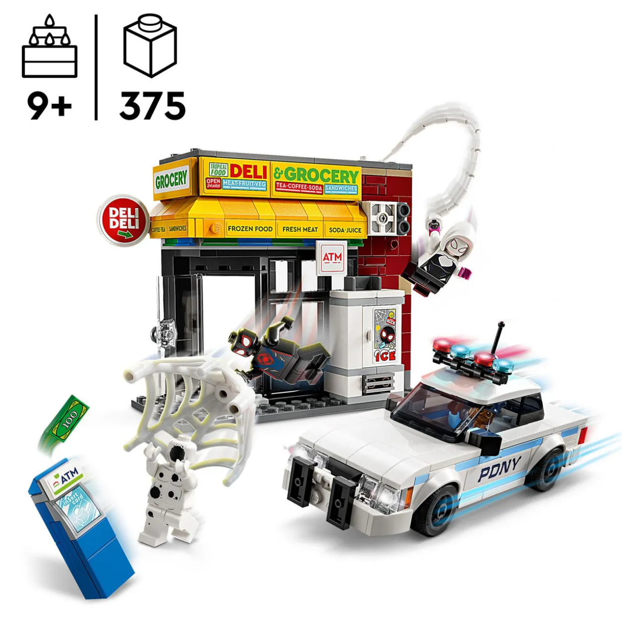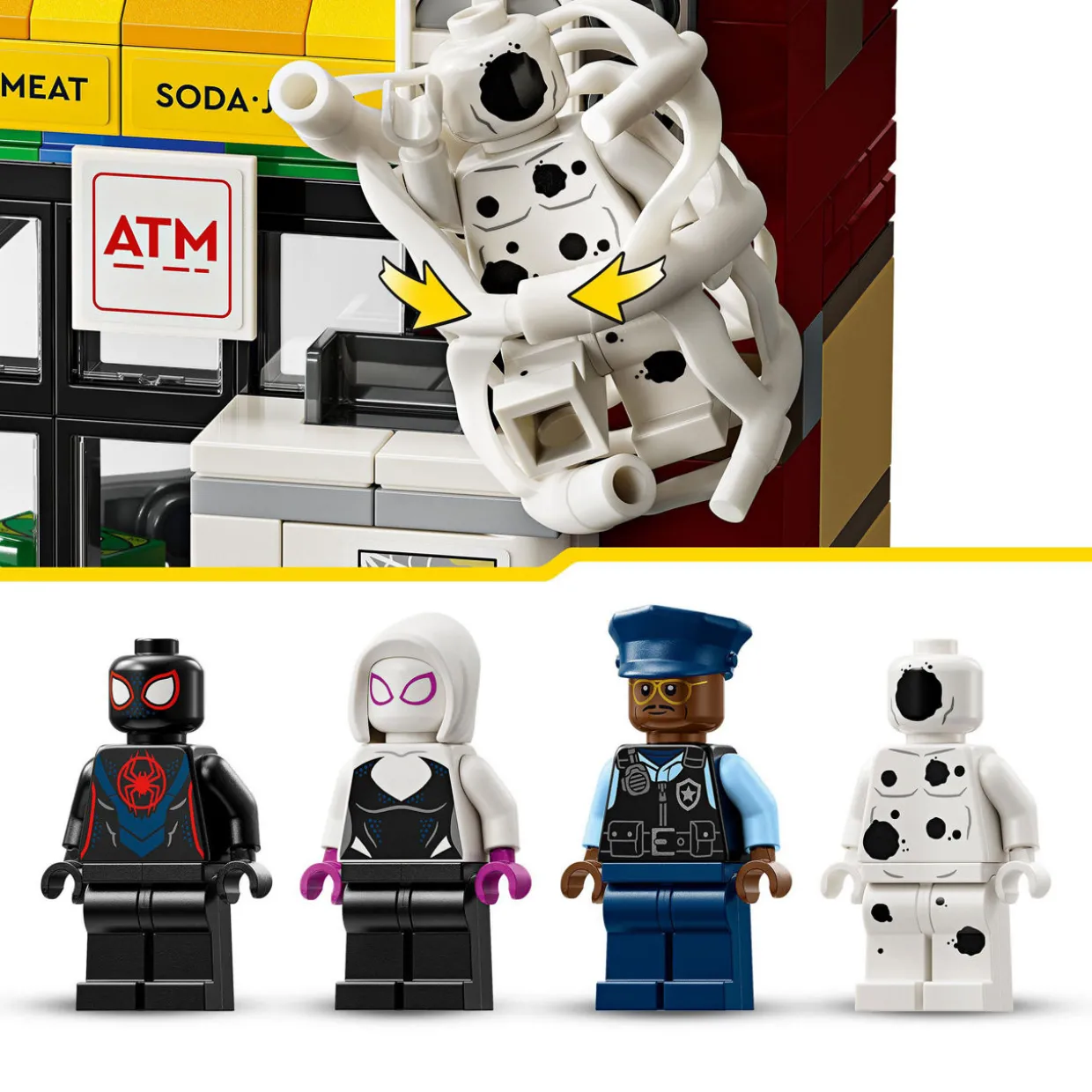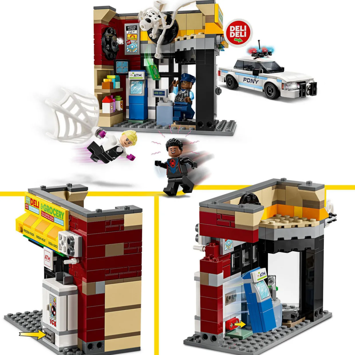 - 375 pieces, includes buildable storefront with Miles Morales, The Spot, Gwen Stacy and Officer Jefferson minifigures, plus web-slinging and role-play accessories