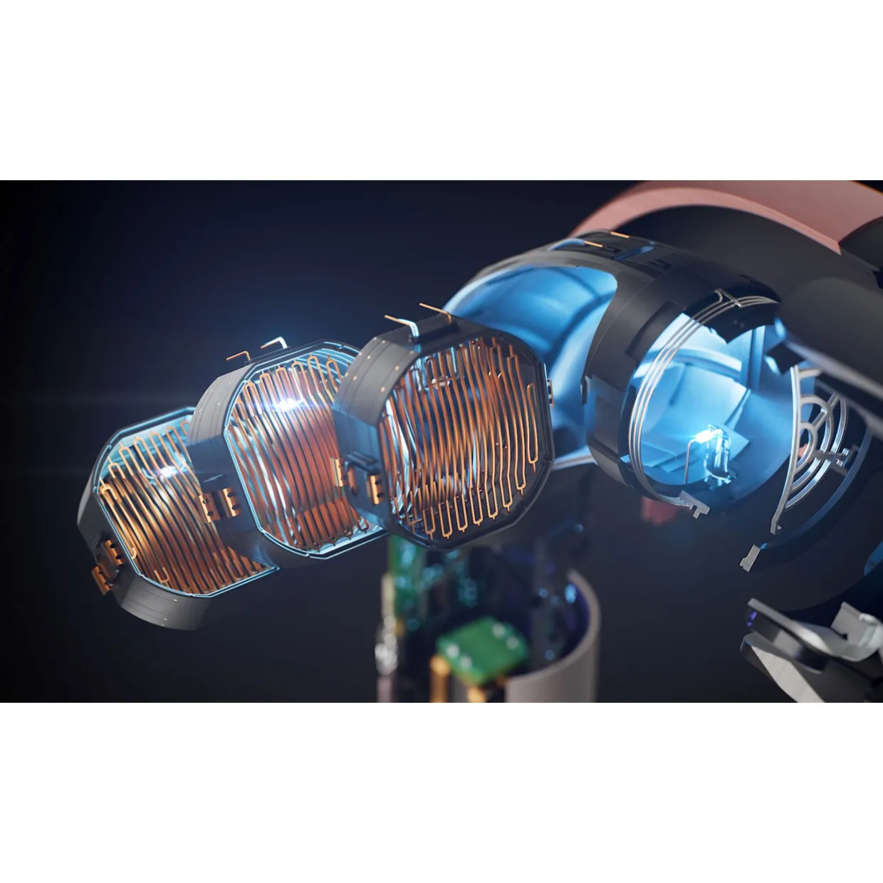 Our most powerful¹ and fastest drying – the Dyson Hyperdymium™ motor produces high-pressure airflow. Spinning at up to 110,000rpm, forming a jet of controlled air. Propelled through the ultra-responsive Streamlined flow heater, 10 heater foils are placed in the curve of the device for air to travel through.