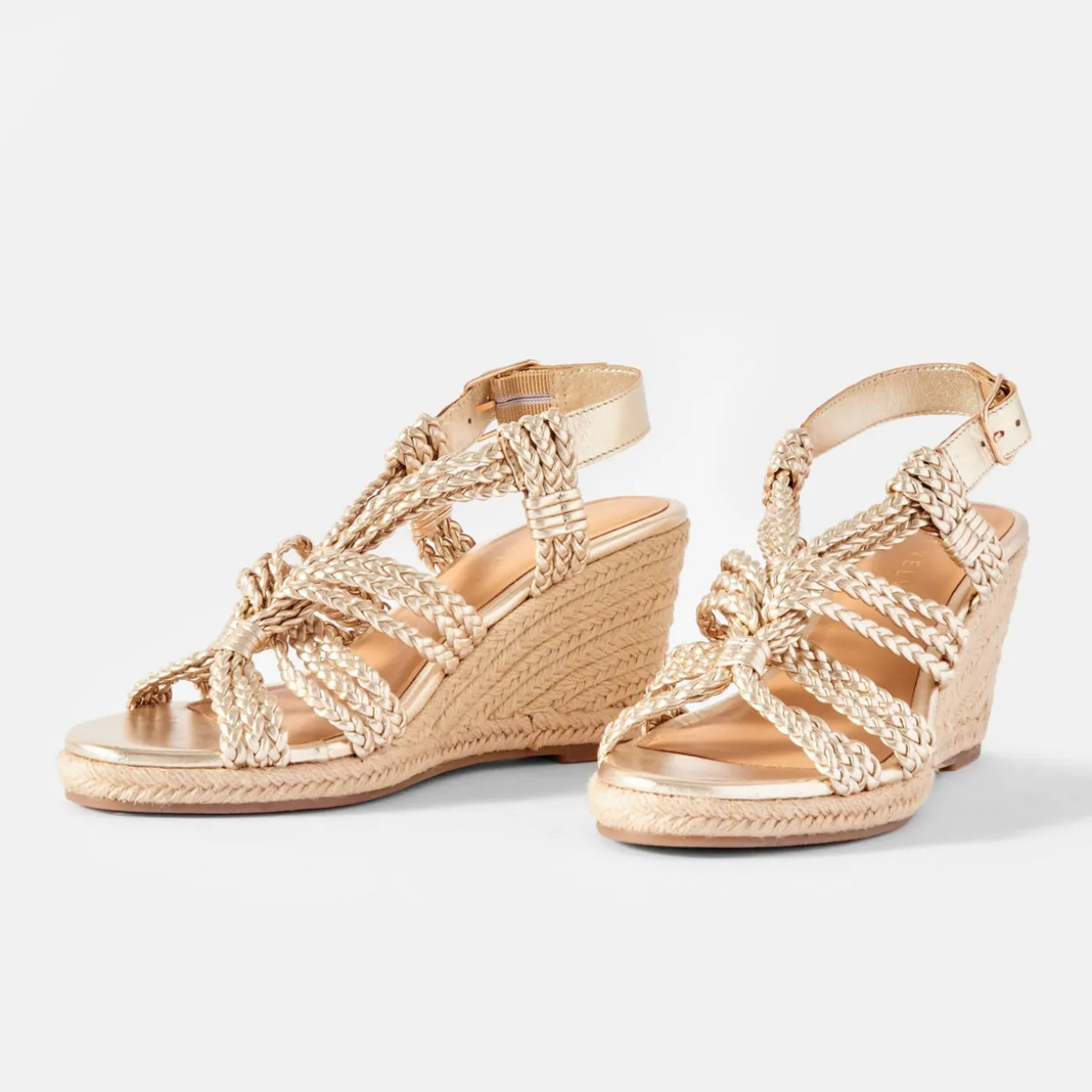 - Woven strap, open toe, high wedge espadrille heel, rubber sole, ankle strap, gold-tone buckle fastening