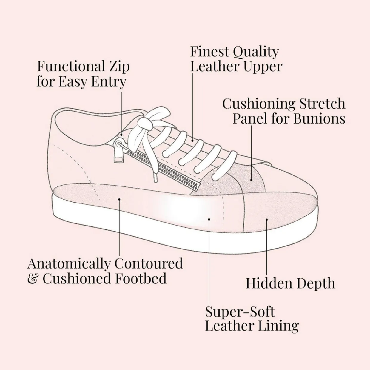 - Low-soled, handcrafted, lace-up fastening, stripe detailing, anatomically cushioned footbed, deep toe box, full soft leather lining, metallic zip fastening for easy entry, Juanet Technology®, innovative Bunion Bed® stretch panel, light and low rubber outsole, podiatrist approved