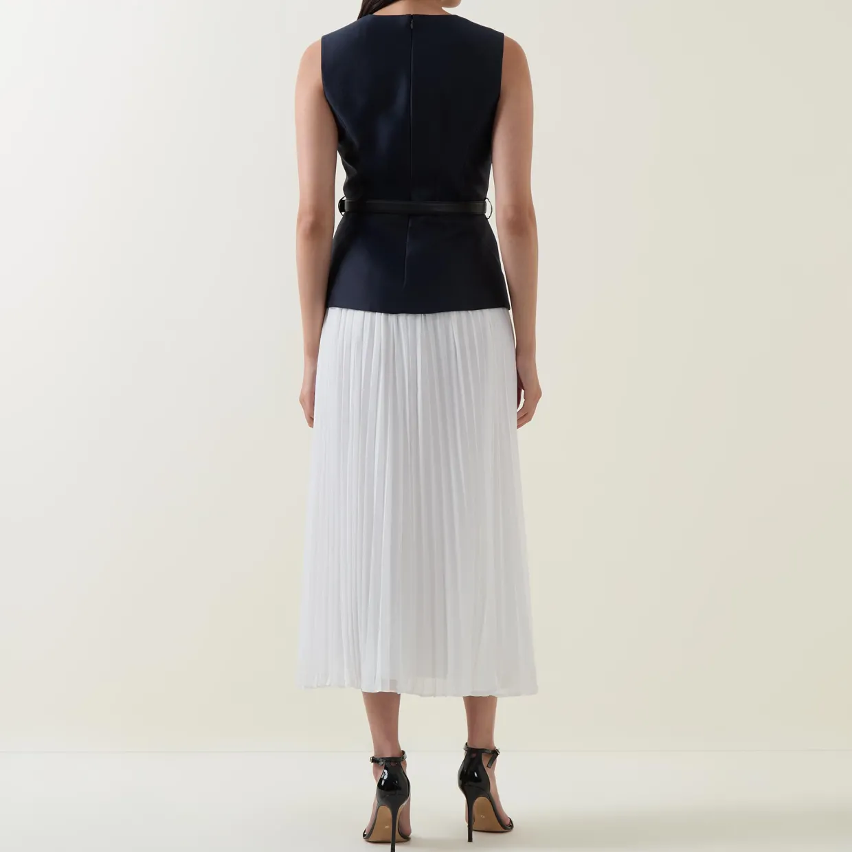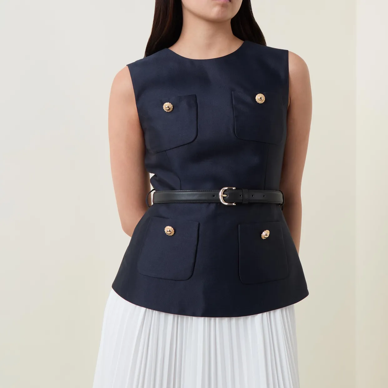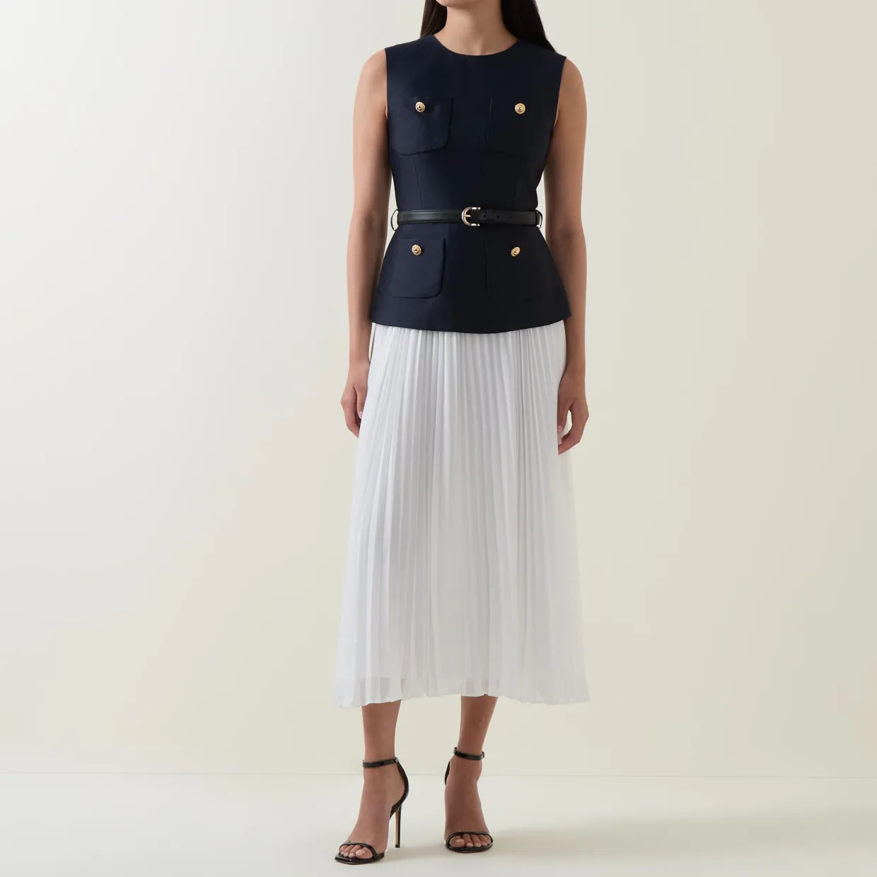 - Sleeveless, round neckline, back zip-fastening closure, four-pocket design, ornate gold-tone buttons, belt loops, adjustable belt, pleated skirt, flared silhouette, midi length