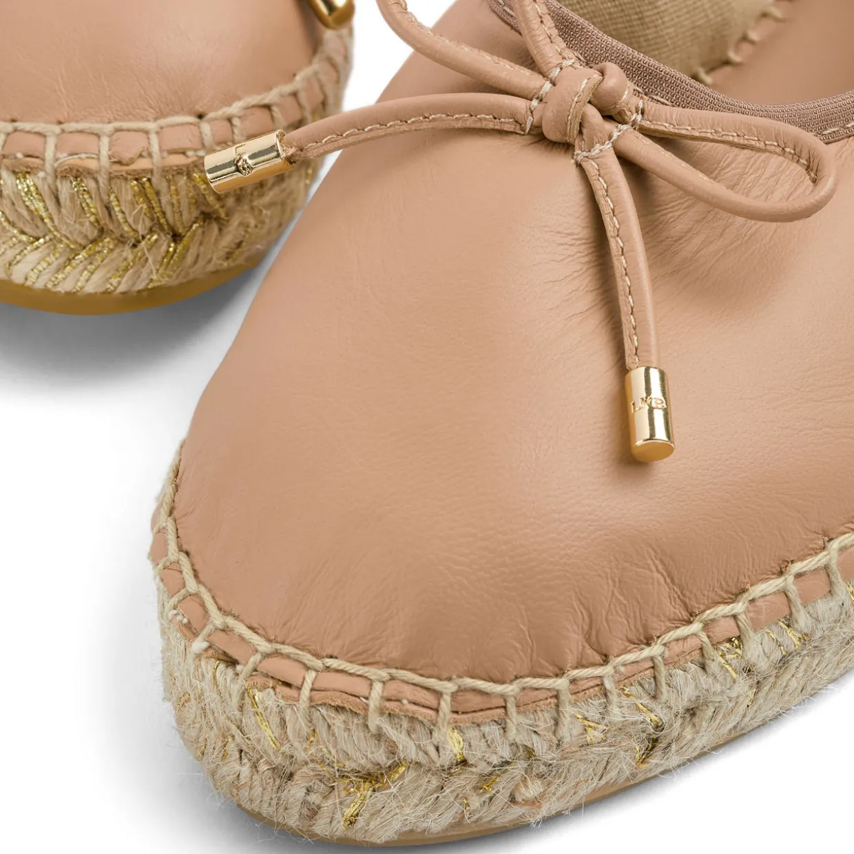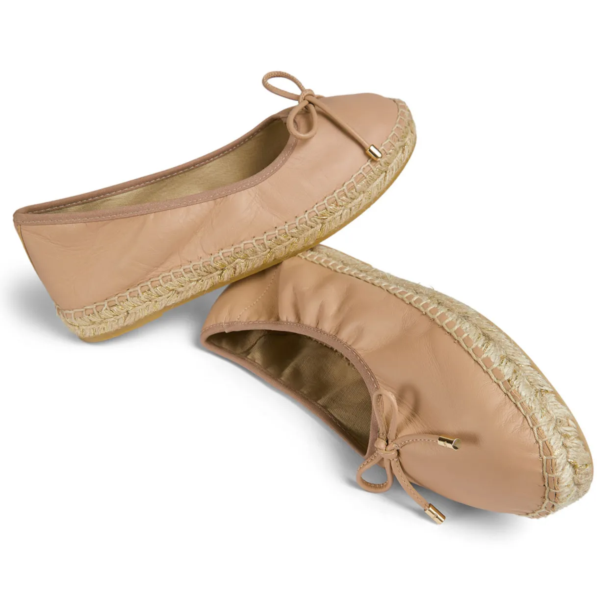 - Round toe, espadrille sole, bow-detail on the upper, gold-tone hardware, smooth leather finish