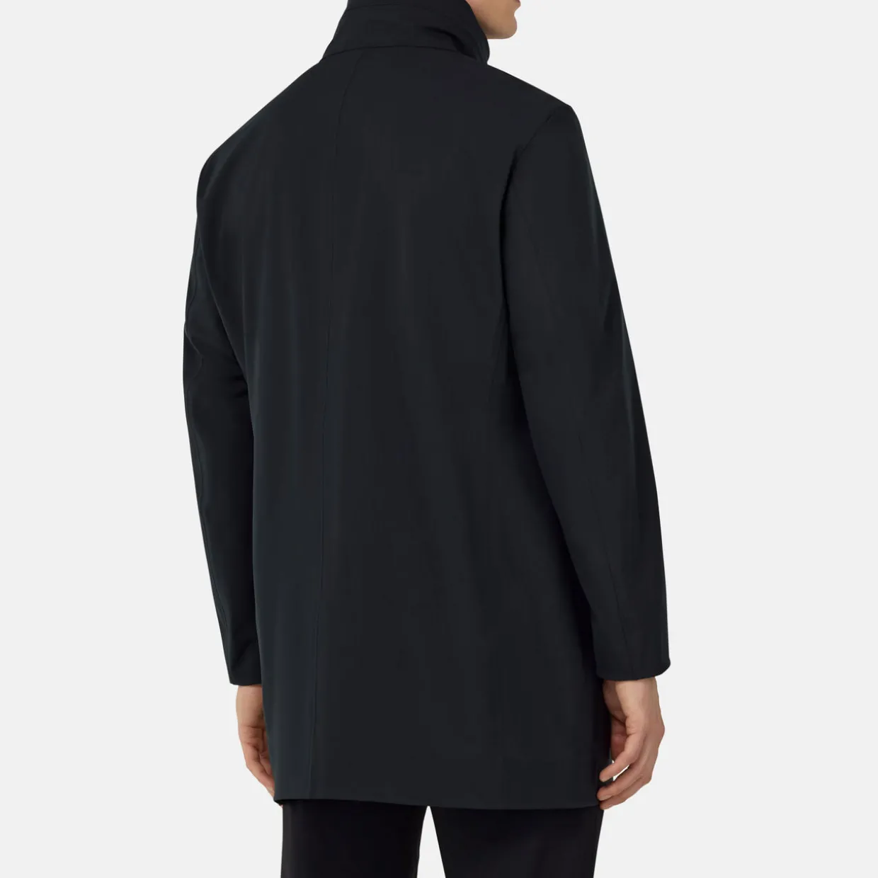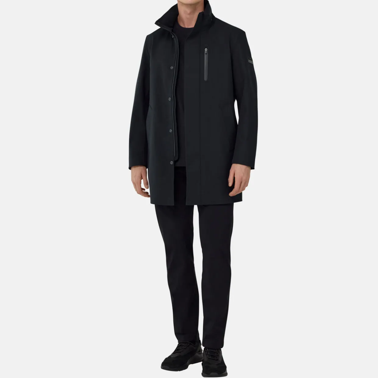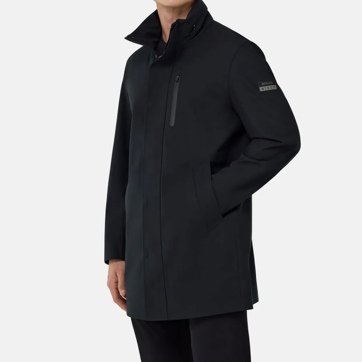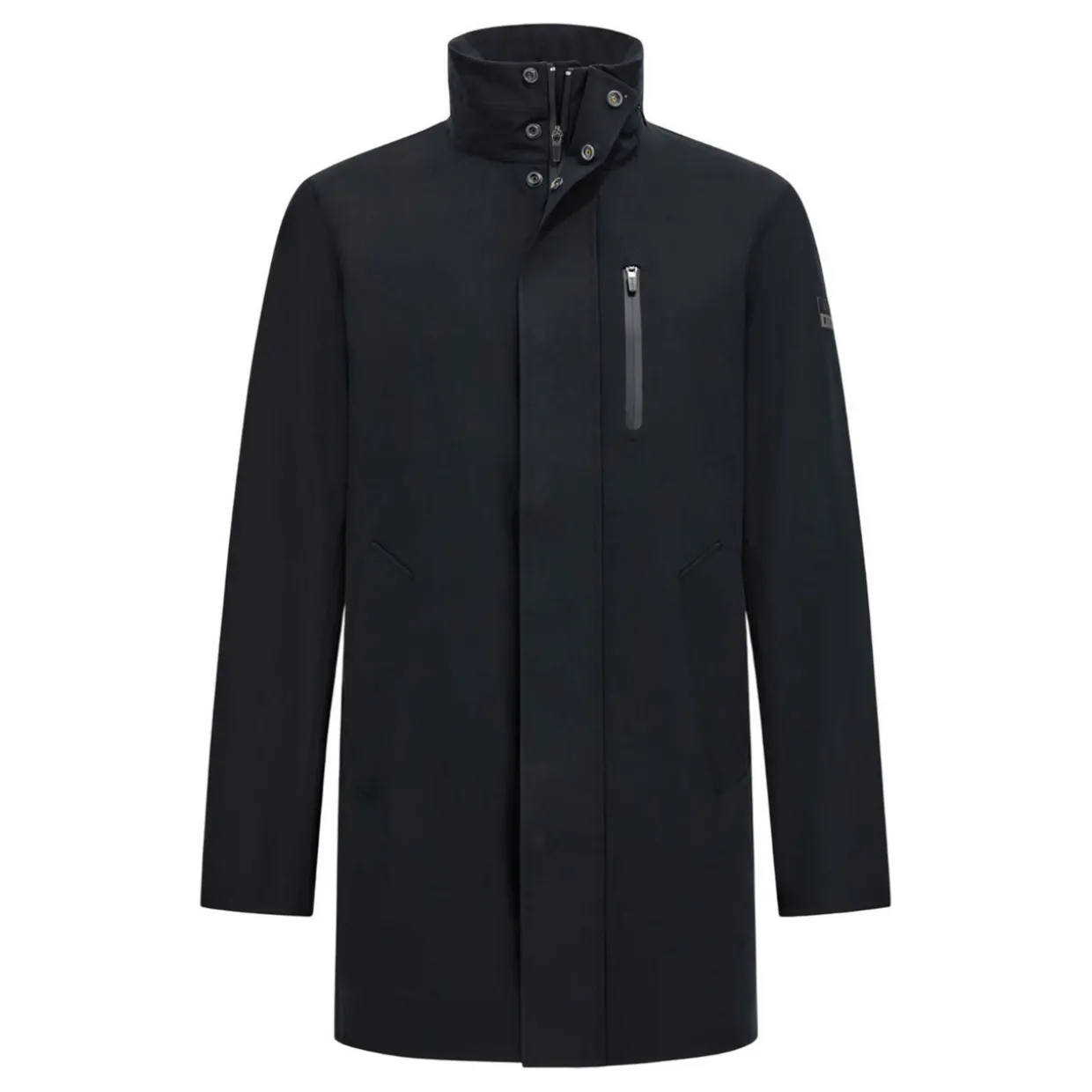 - Stand collar, long sleeves, front zip fastening, additional snap button placket, one vertical chest pocket with zip fastening, two angled welt pockets, straight hem, logo detail