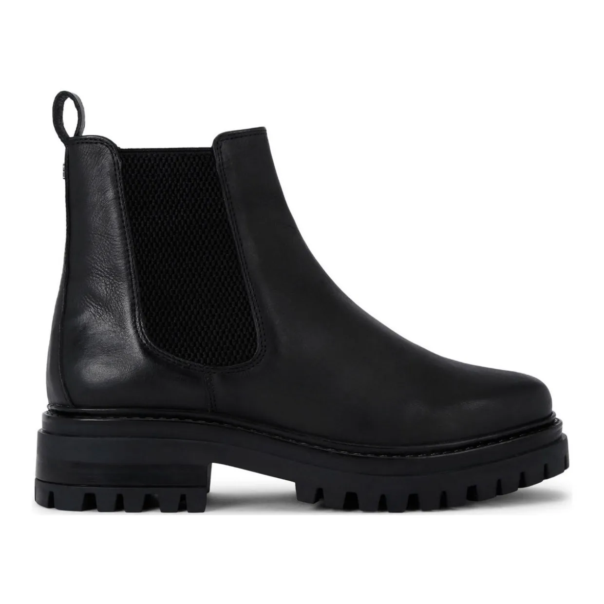- Chelsea style, leather upper, two elasticated panels, slip-on style, tread sole, heel pull tab, branding details, block heel, rounded toe