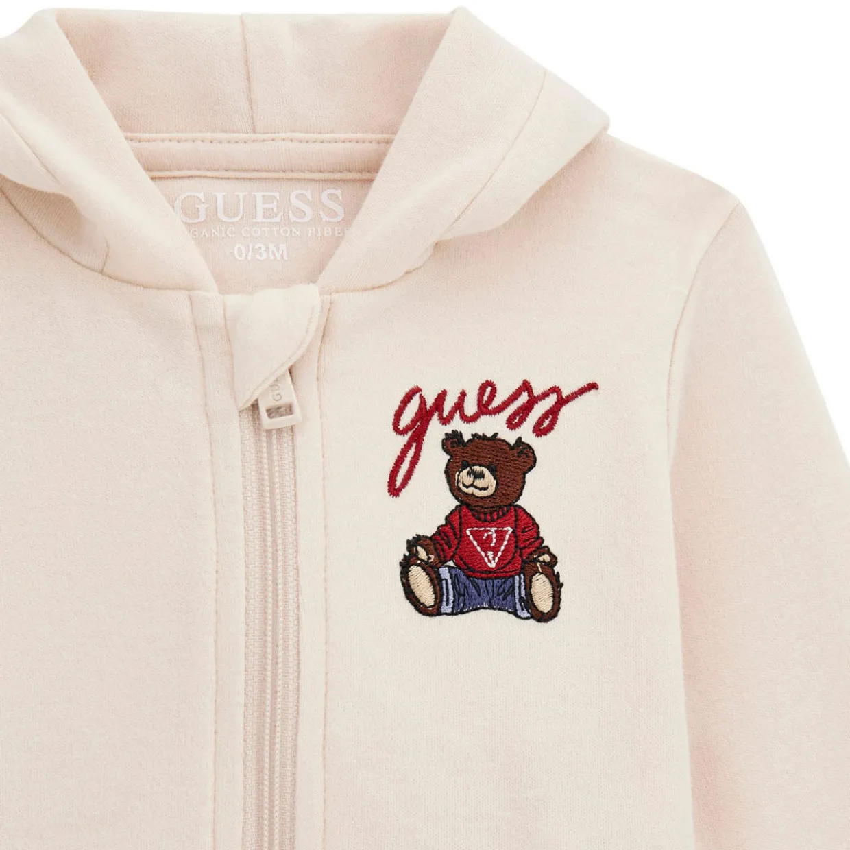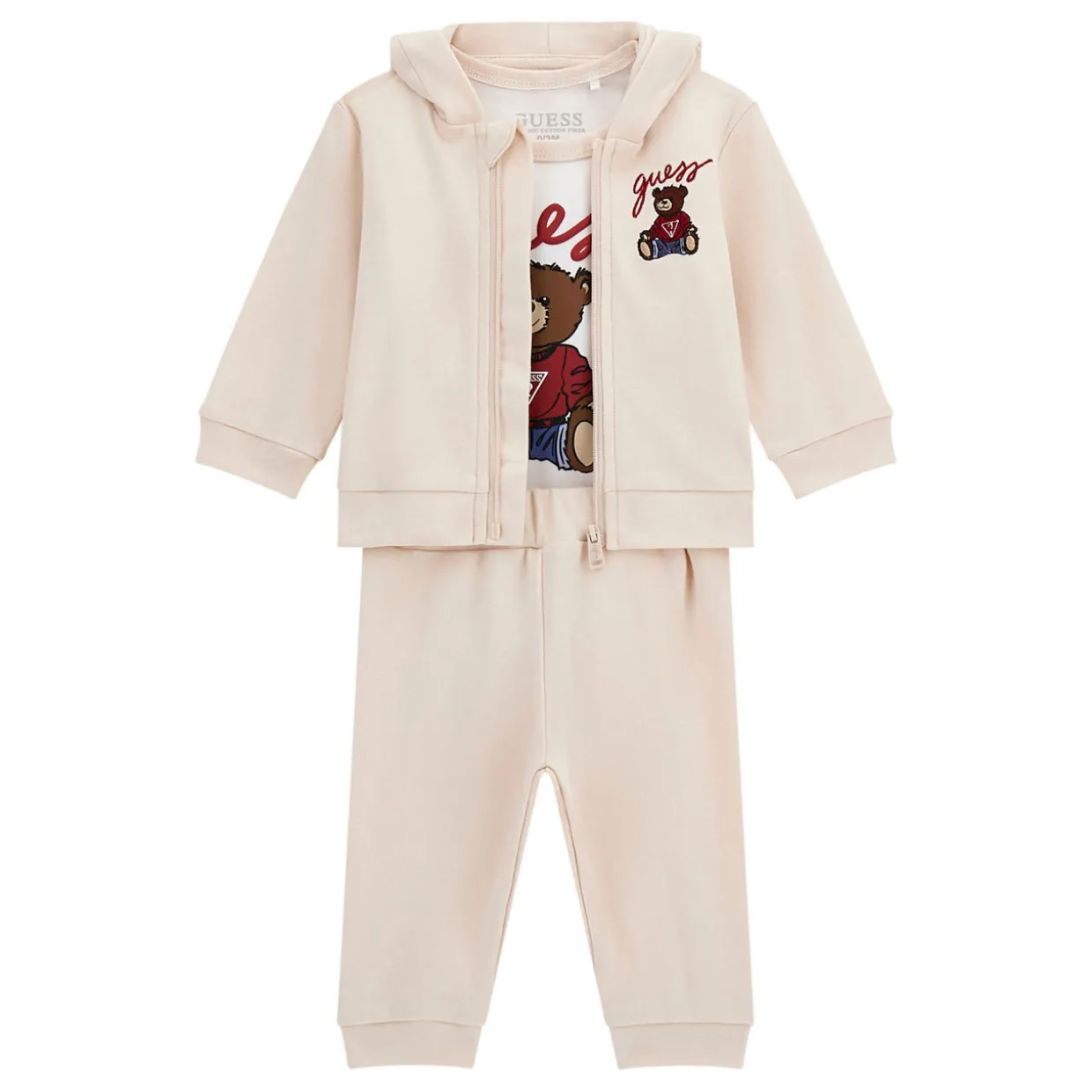 - Top: Long sleeves, hood, zip fastening, teddy bear logo detail. Bottoms: Elasticated waistband, logo cuffs. Bodysuit: Long sleeves, envelope neckline, snap button fastenings, teddy bear logo detail