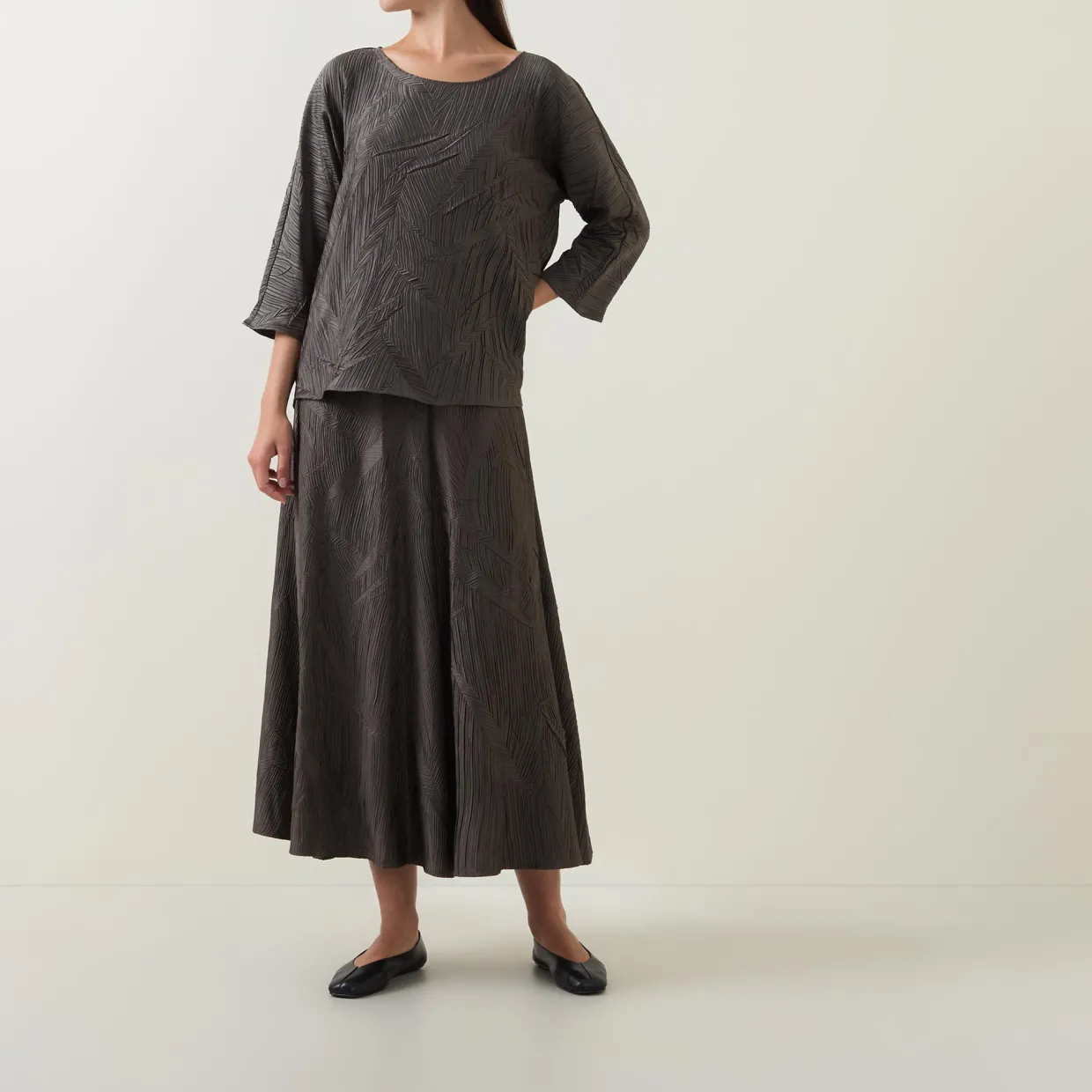 - Mid-rise, elasticated waistband, flared design, textured pattern, midi length
