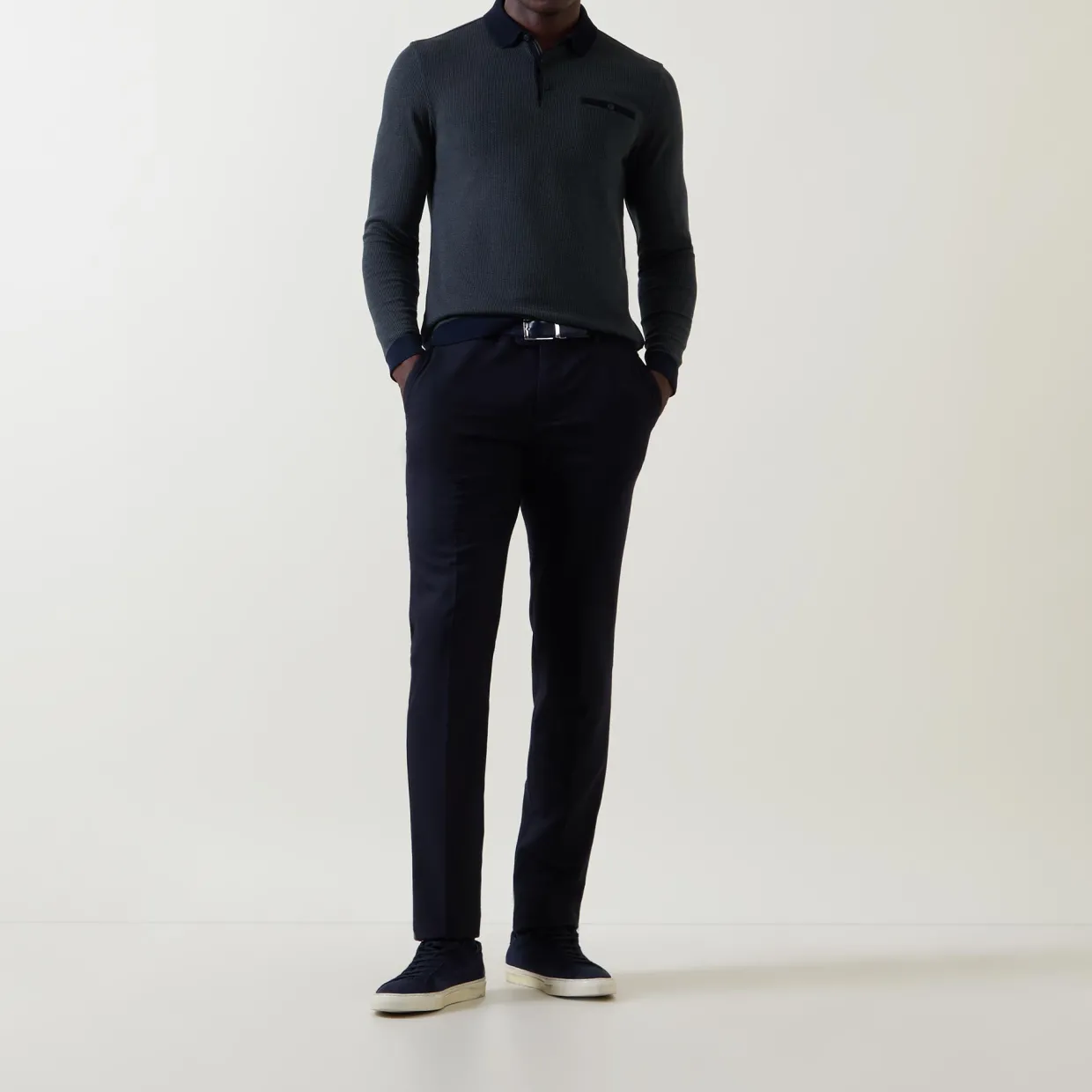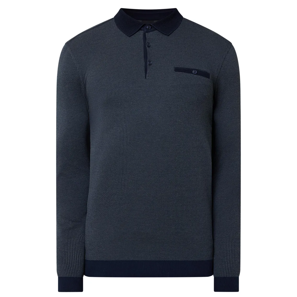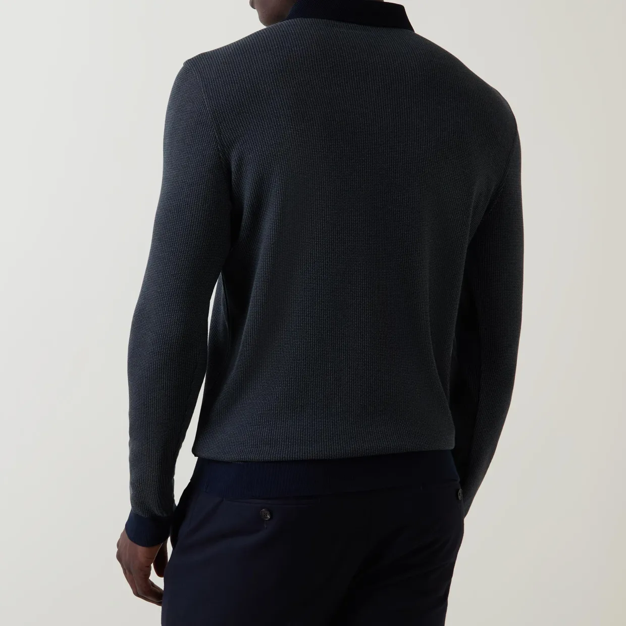- Flat polo collar, long sleeves, three-button placket, chest welt pocket, elasticated hemline, stretch cuffs, textured finish