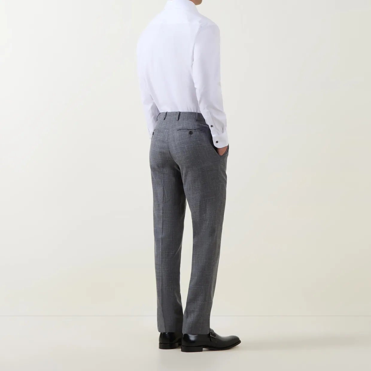 - Single cuffs, long sleeves, pointed collar, curved hemline, button fastenings, textured finish