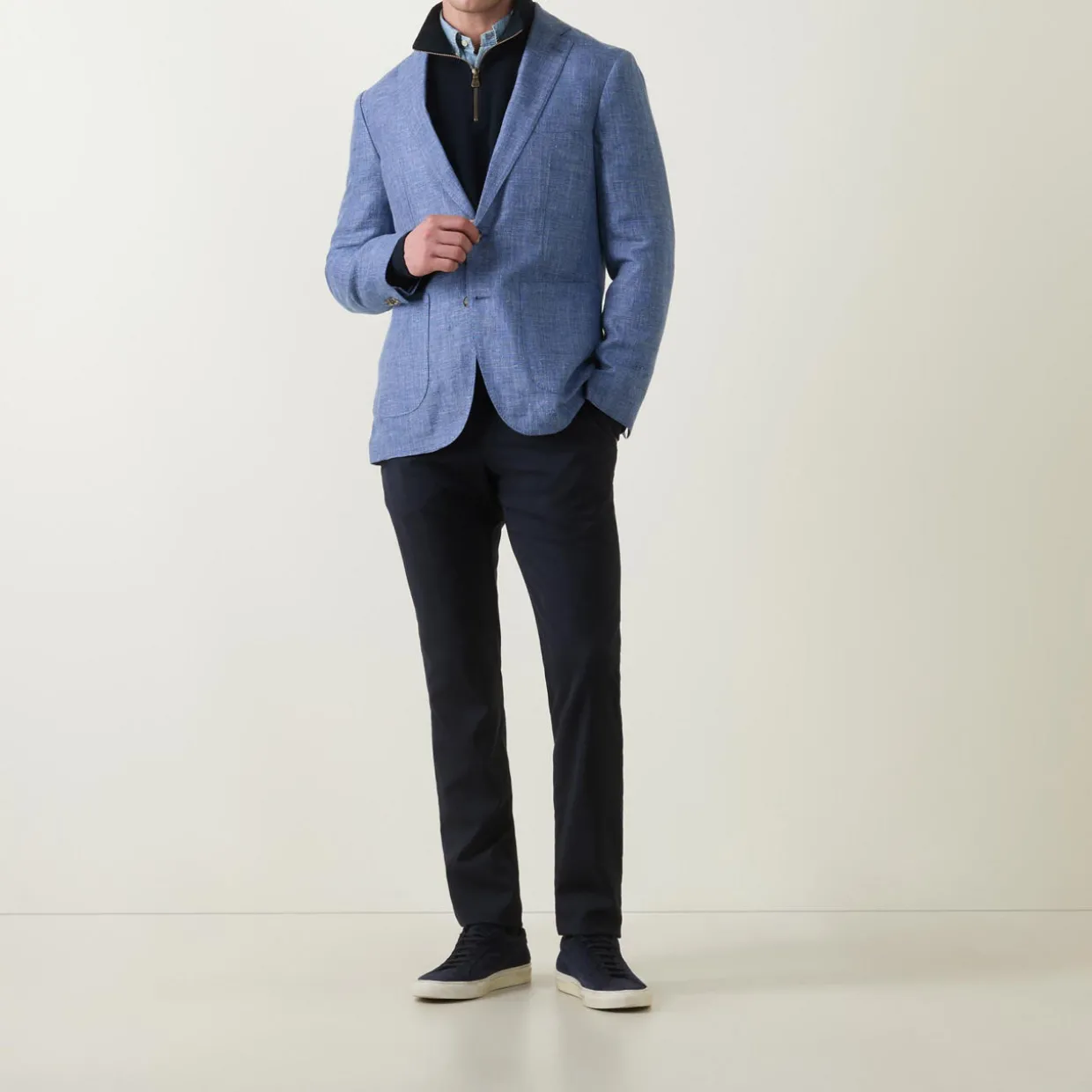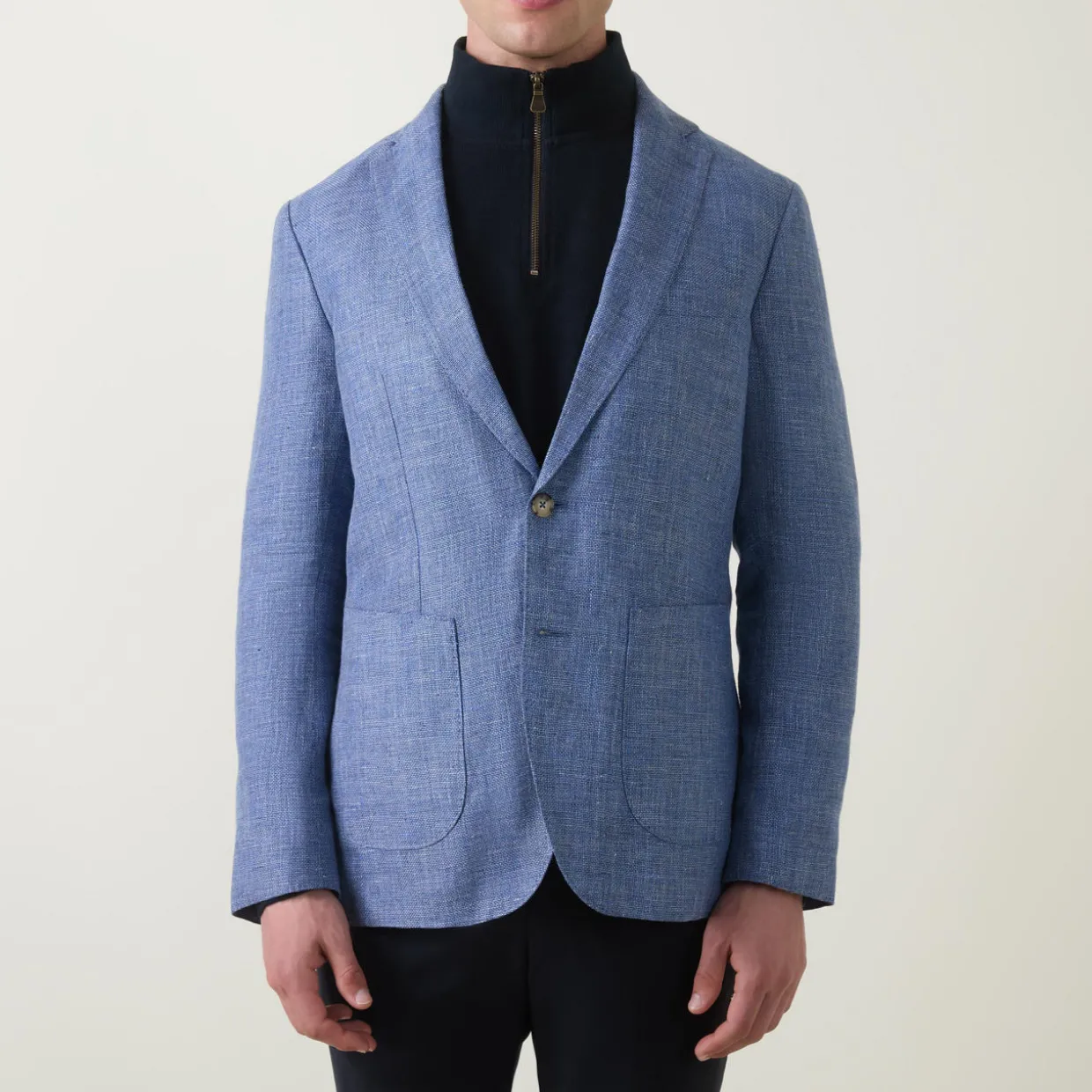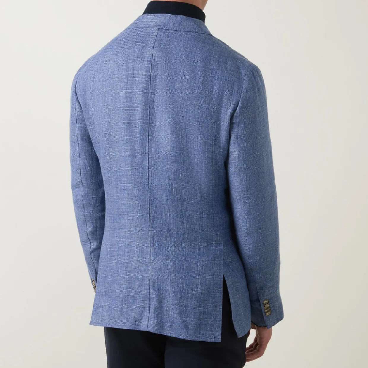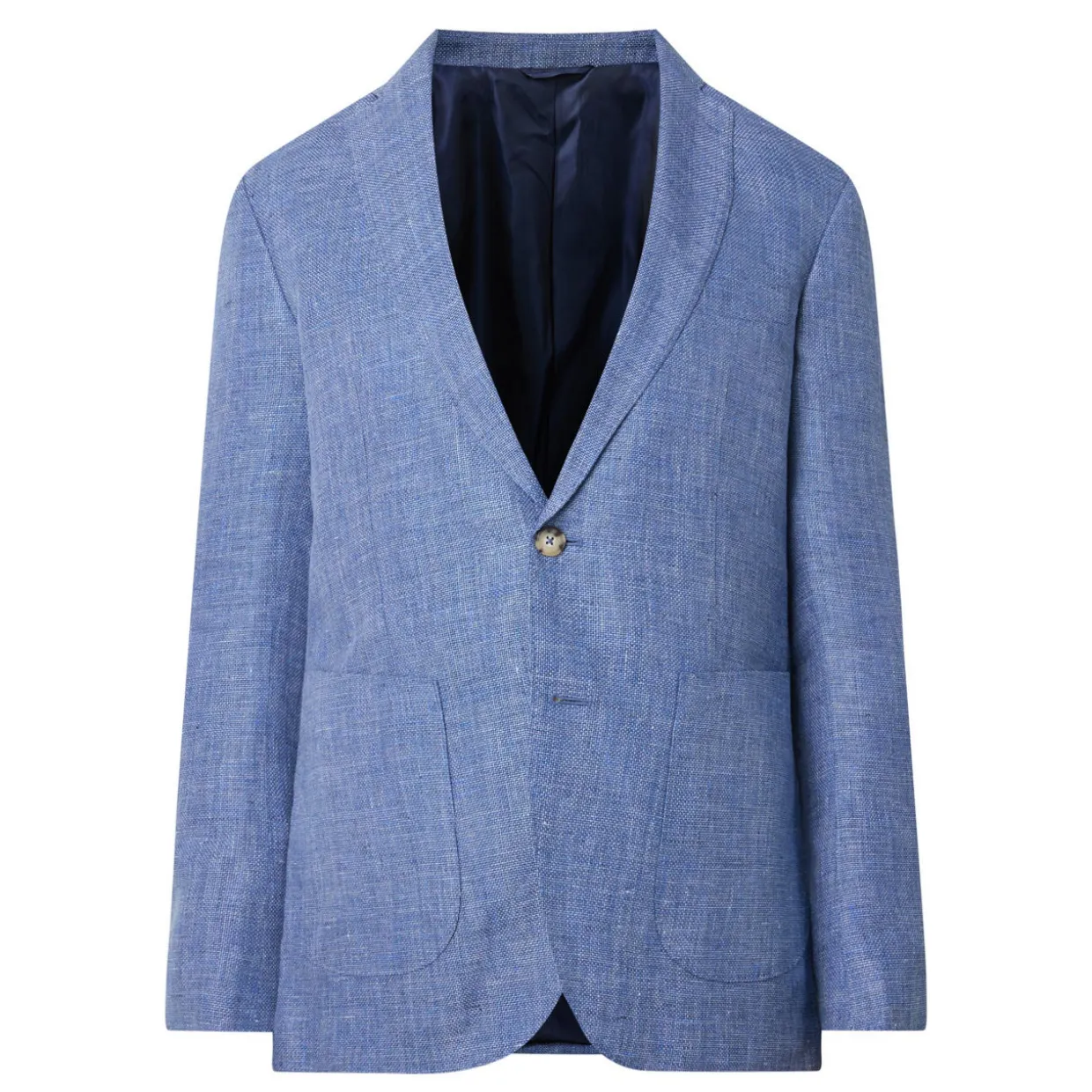 - Single-breasted front, notched lapels, long sleeves, button fastening, chest welt pocket, two side patch pockets, two side hem vents, buttoned cuffs, smooth fabric