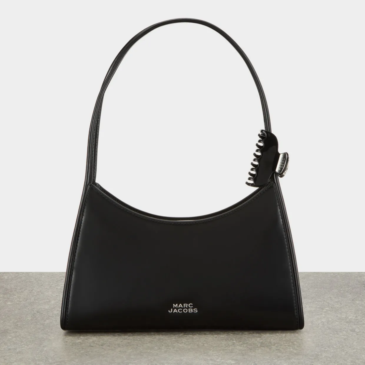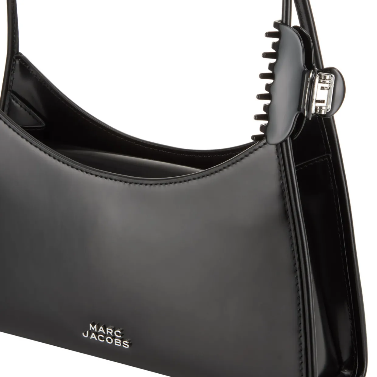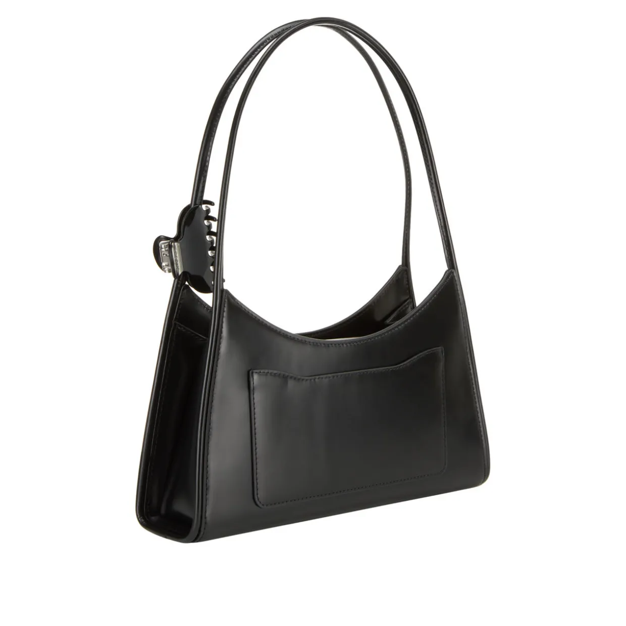 - One fixed shoulder strap, magnetic bridge closure, silver-tone hardware, tonal stitching, logo lettering, logo claw clip, back slip pocket, smooth leather finish