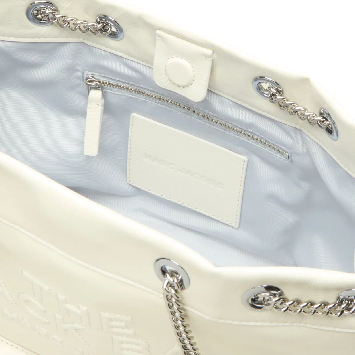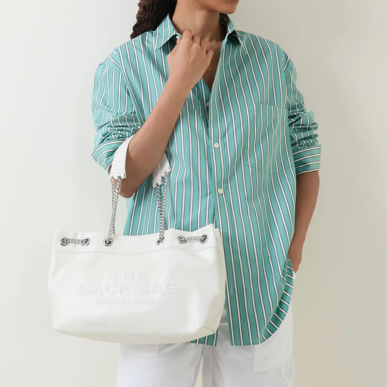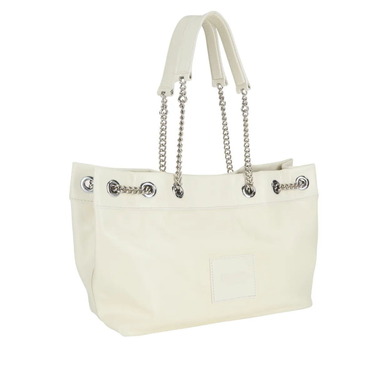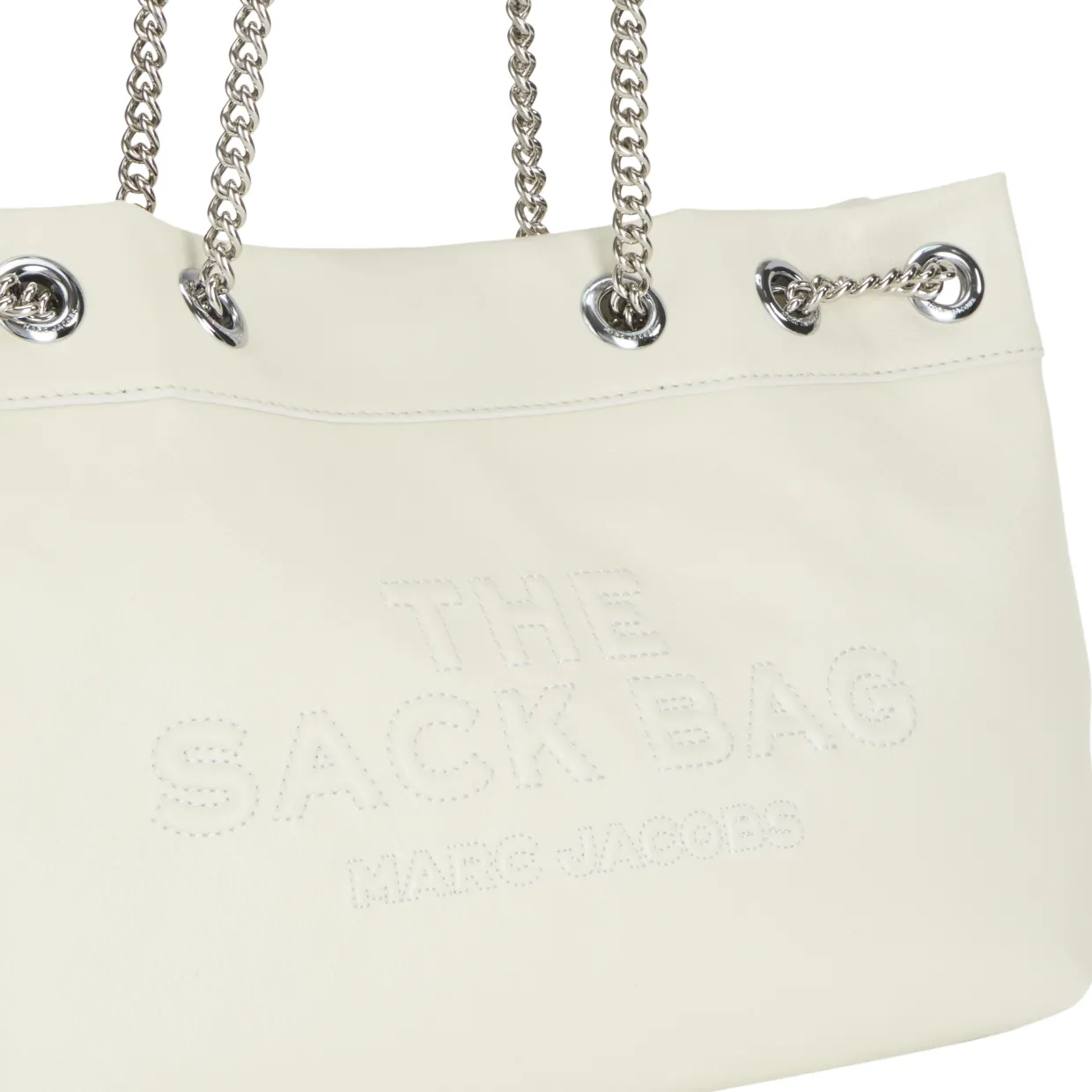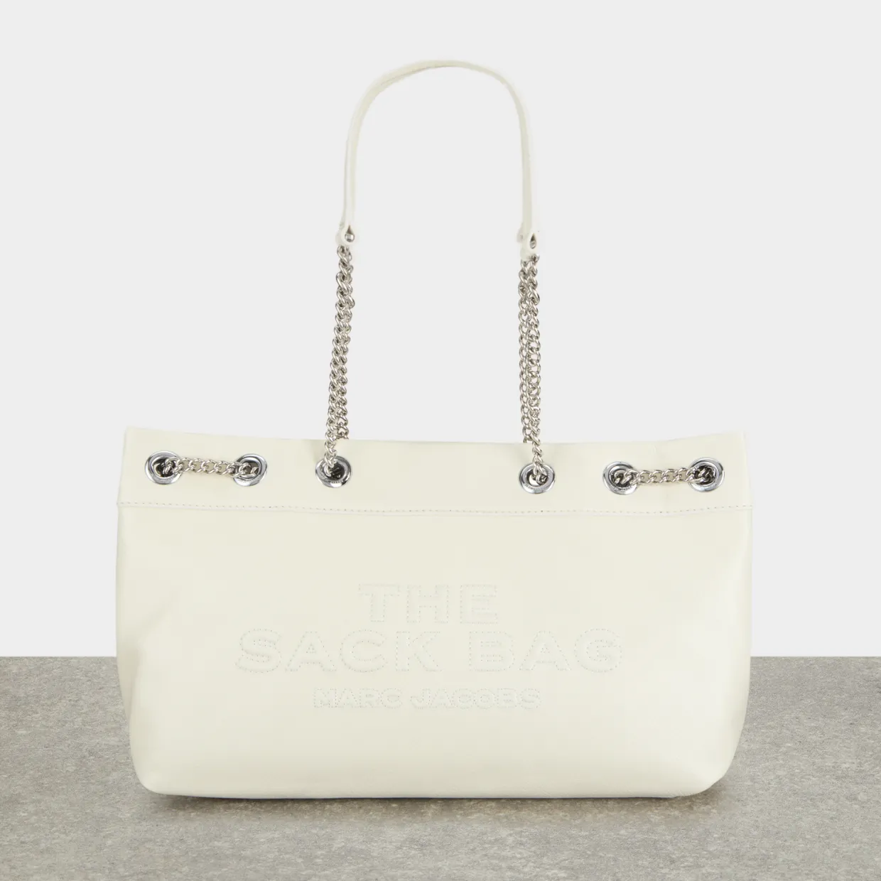 - Two chain shoulder straps, magnetic button fastening, silver-tone hardware, slouchy design, tonal stitching, logo branding to the front, grained leather finish