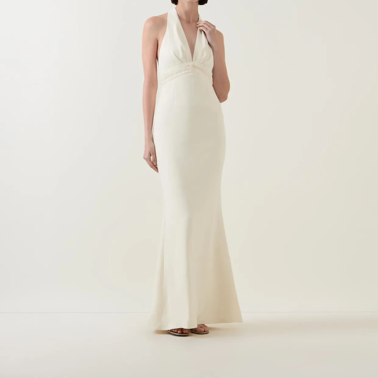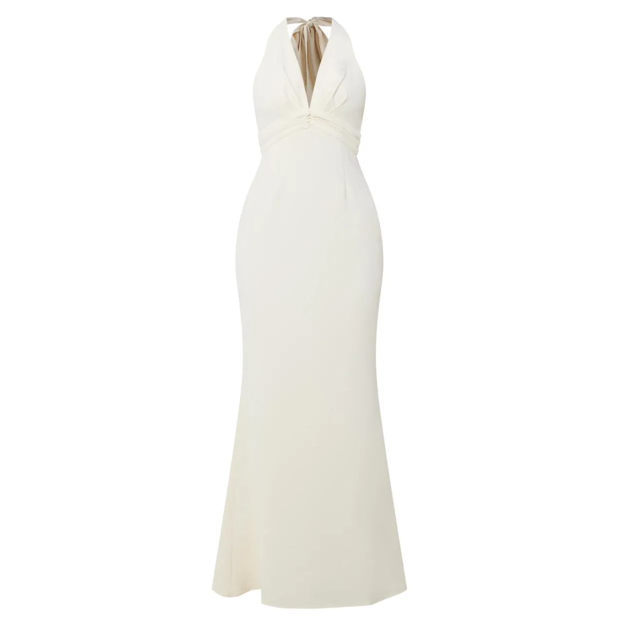 - V-neckline, low back, adjustable tie neckline, discreet zip fastening, no stretch fabric, sleeveless, maxi length