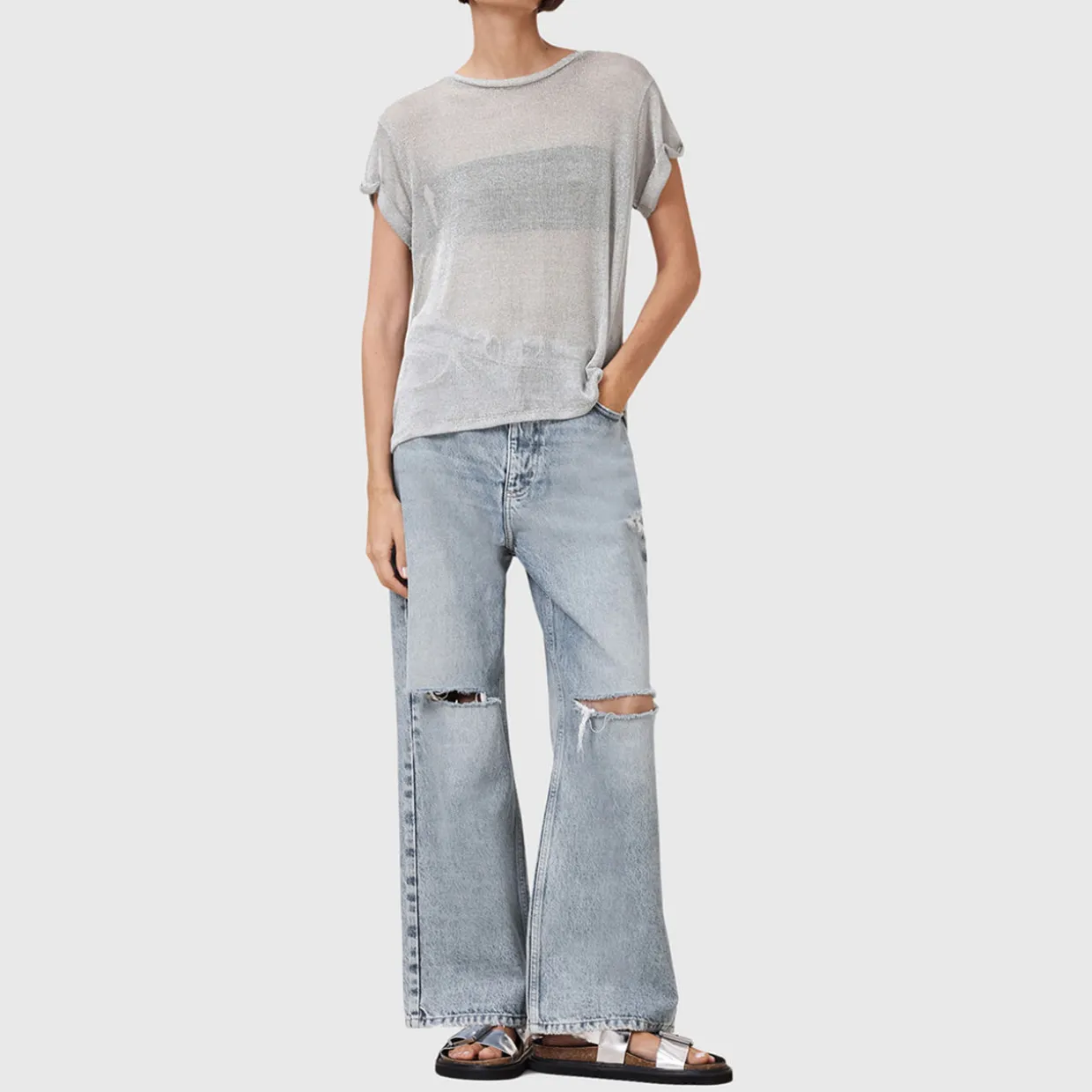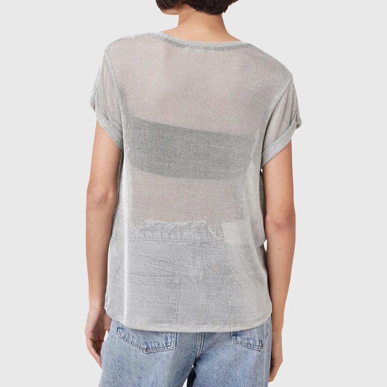 - Sheer, sparkle fabrication, crew neckline, short sleeves, pull-on style
