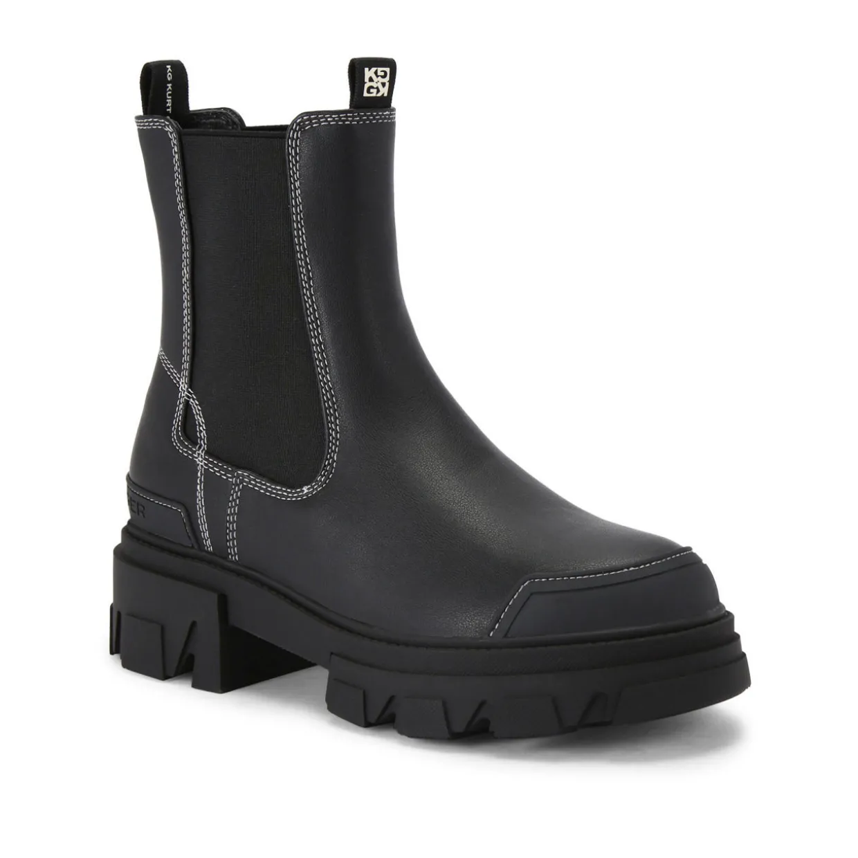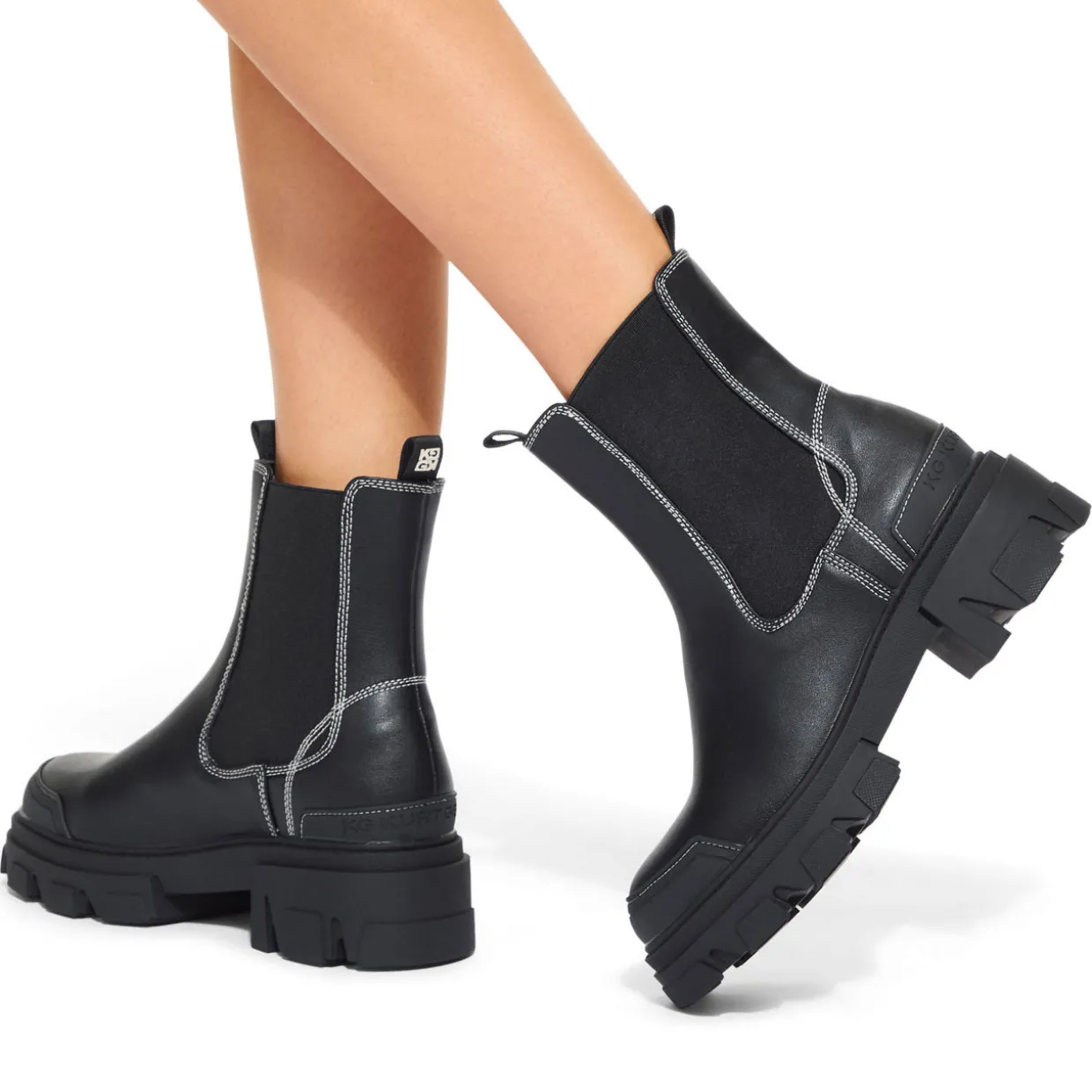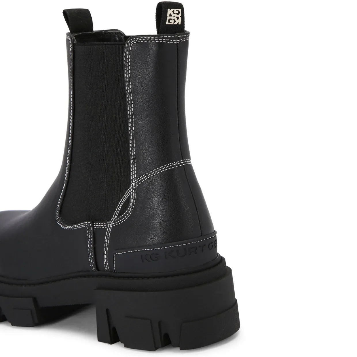 - Round toe, elasticated side panels, contrast topstitching, chunky tread sole, pull tab