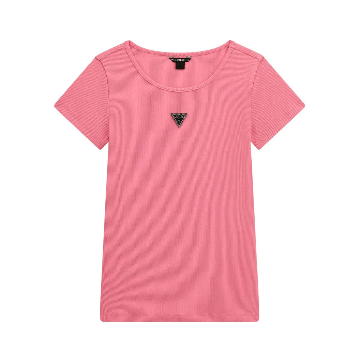 - Ribbed knit style, round neckline, short sleeves, triangle logo detail with sequin embellishment