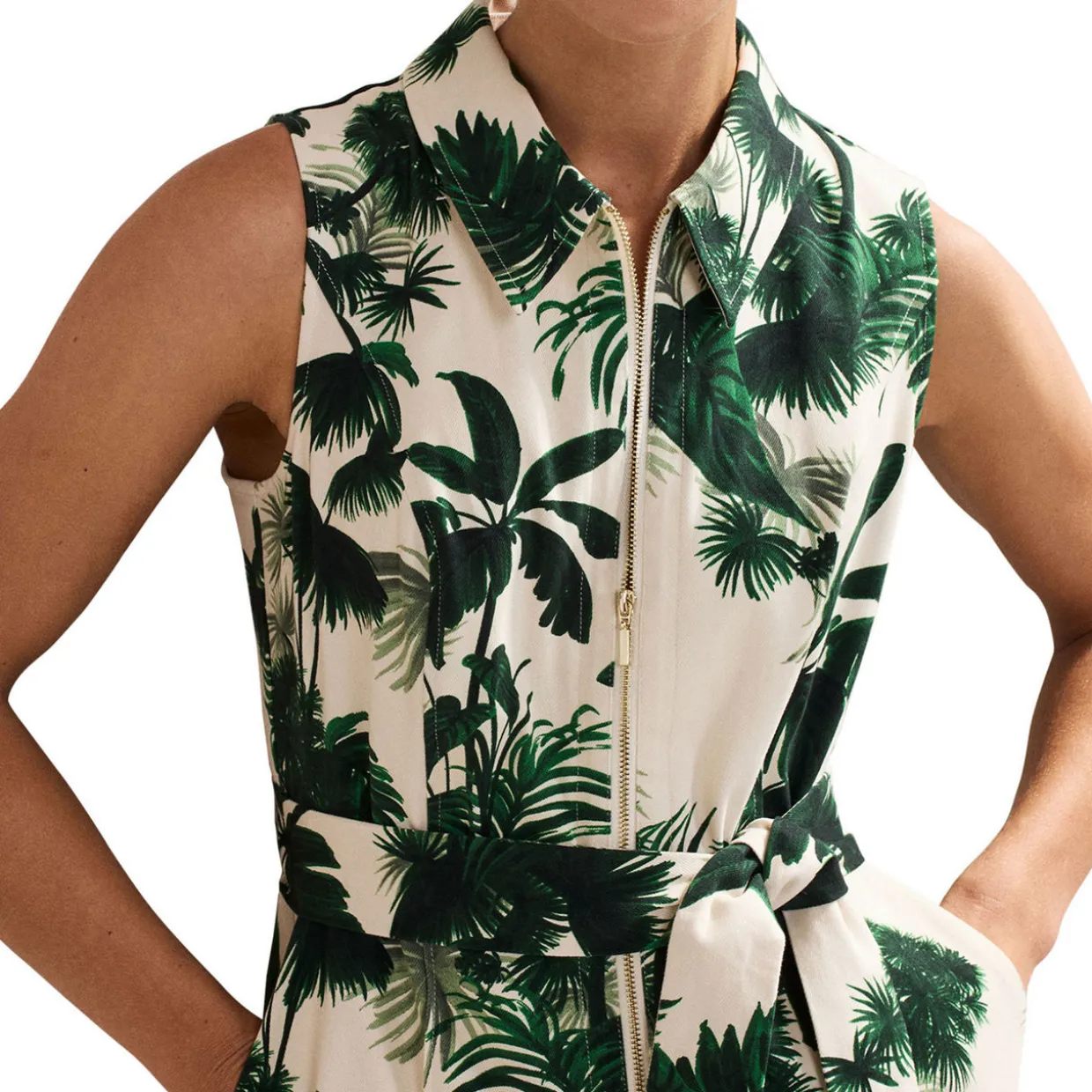 - Denim fabric, palm print, zip through detailing, structured front seams, structured silhouette, zip fastening