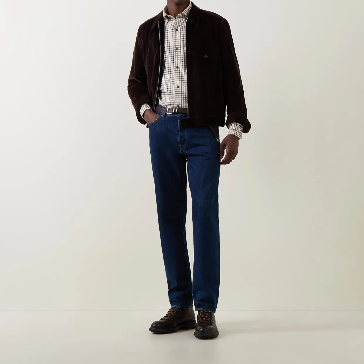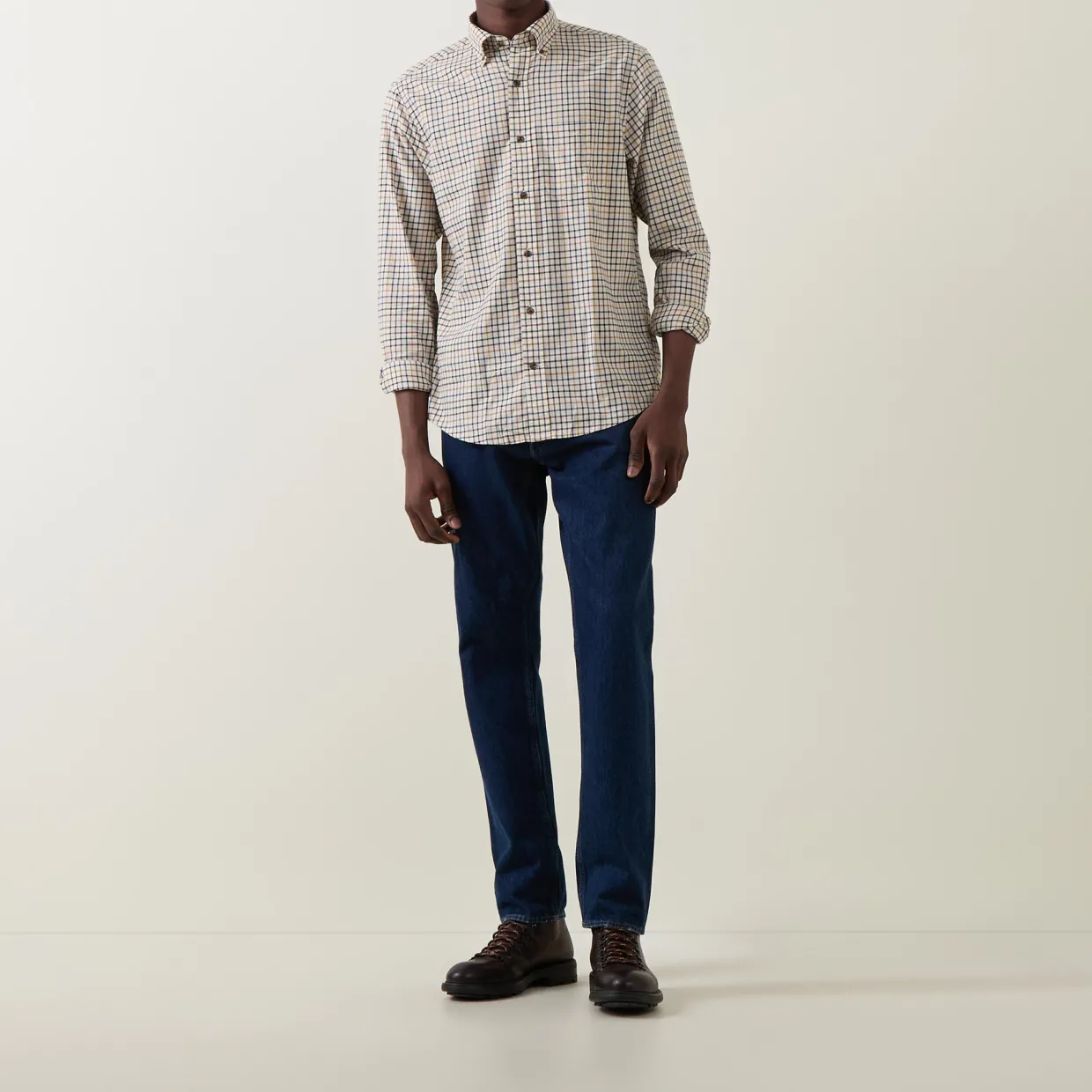 - Button-down collar, long sleeves, check pattern, curved hemline, button fastenings, logo detail