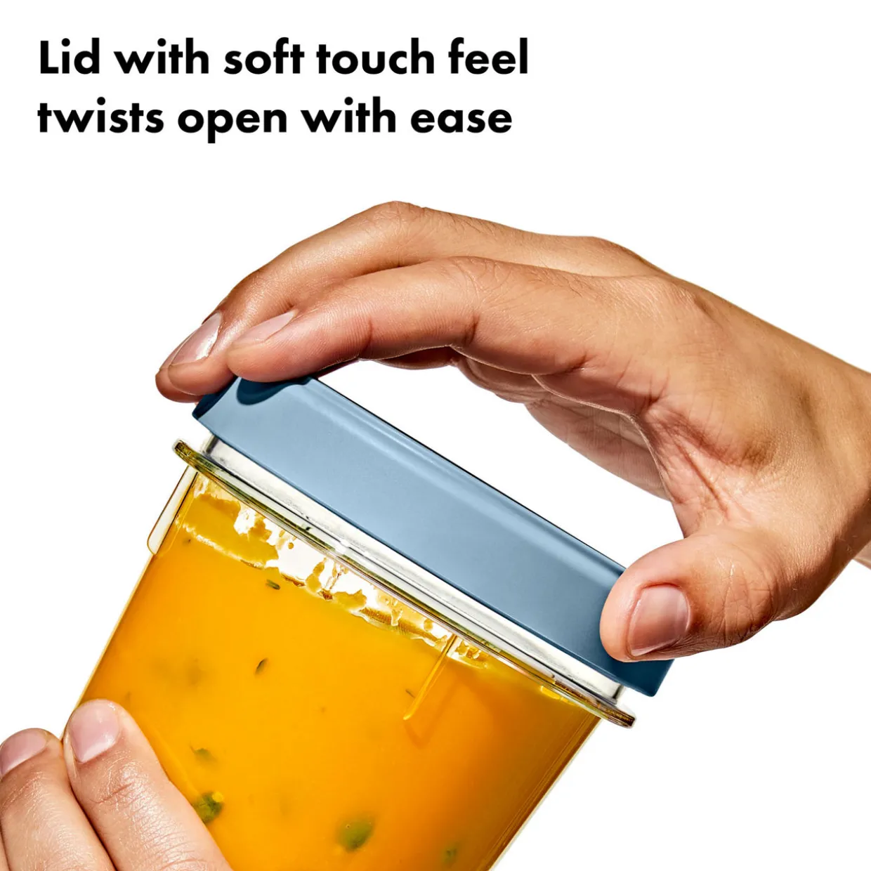 - Two-piece storage set, stain-resistant, durable, stackable, universal twistable lids with a soft touch grip, internal gasket with leak-proof seal
