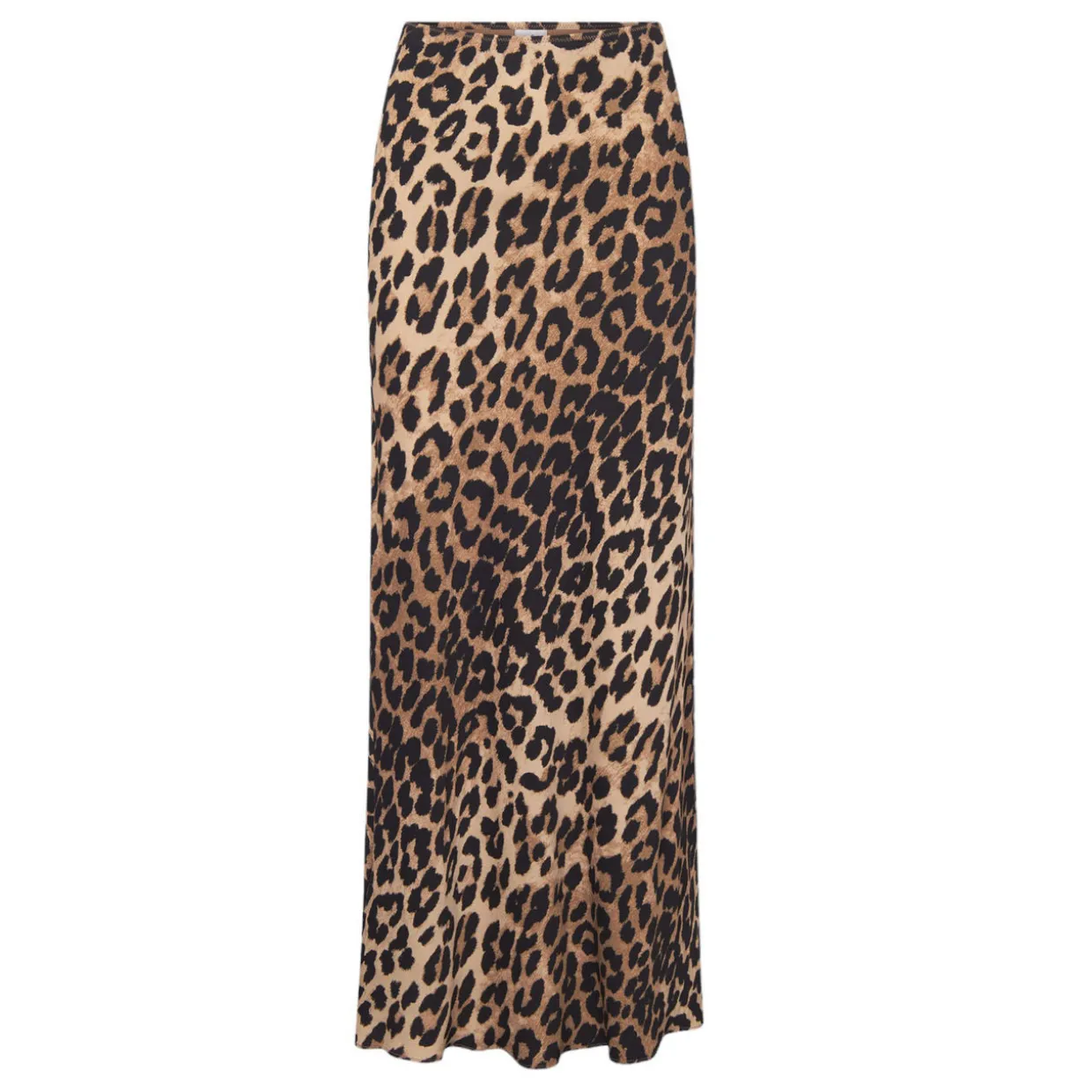 - High-rise, elasticated waistband, flared hem, bias-cut, all-over leopard print pattern, shiny satin finish, maxi length