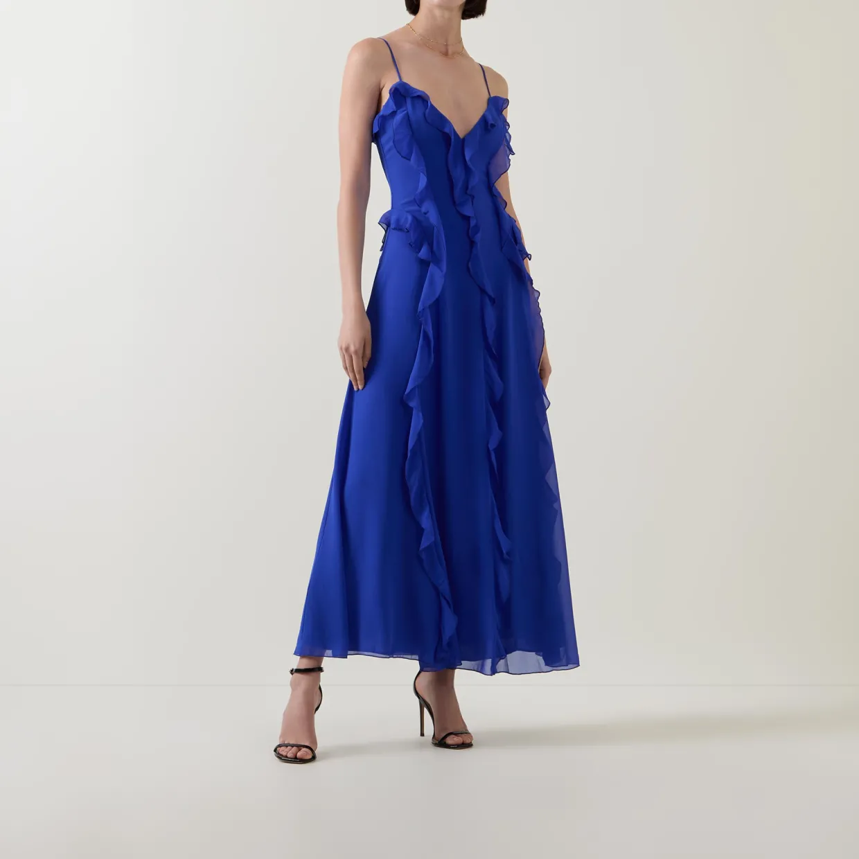 - Sleeveless, thin adjustable spaghetti straps, V-neckline, back zip-fastening closure, ruffle trim embellishment, flared silhouette, maxi length