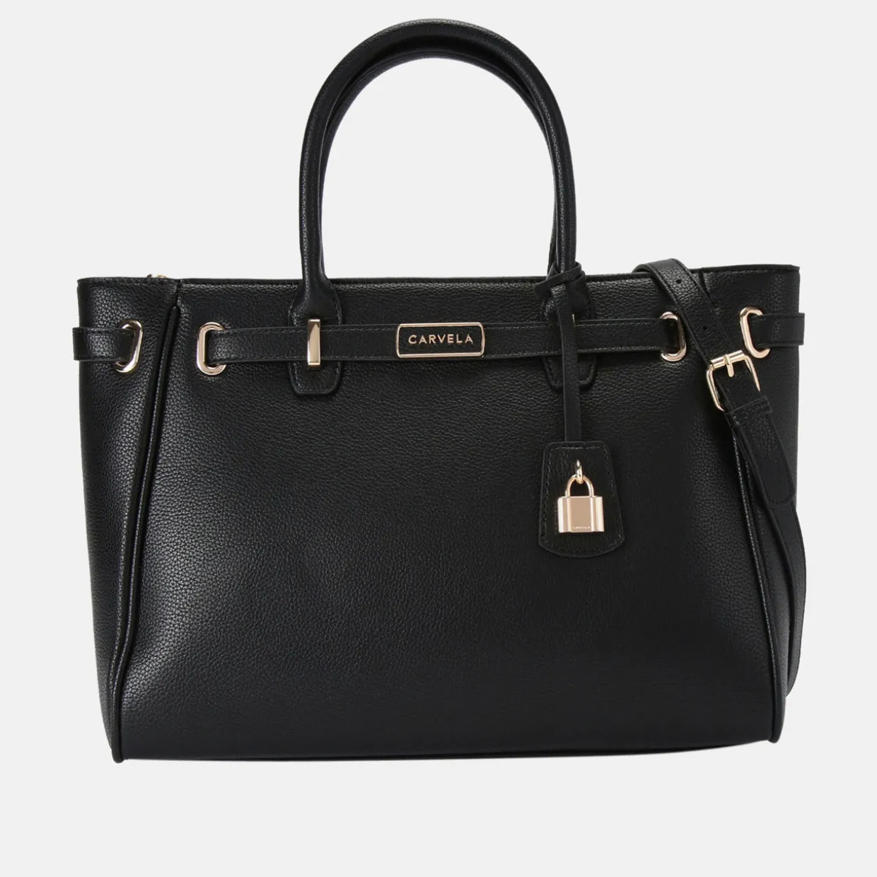 - Textured brown upper, branded belt around the straps, gold-tone hardware, two top handles, top zip fastening, can fit laptops up to 14-inches, padlock charm detail, shoulder strap