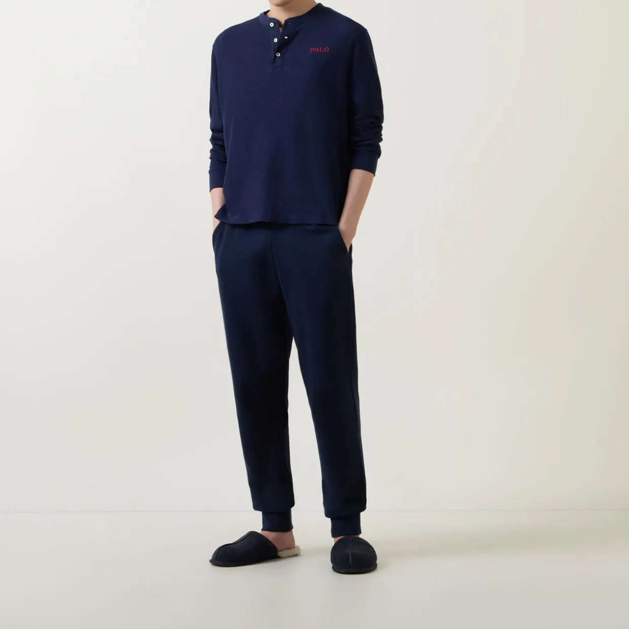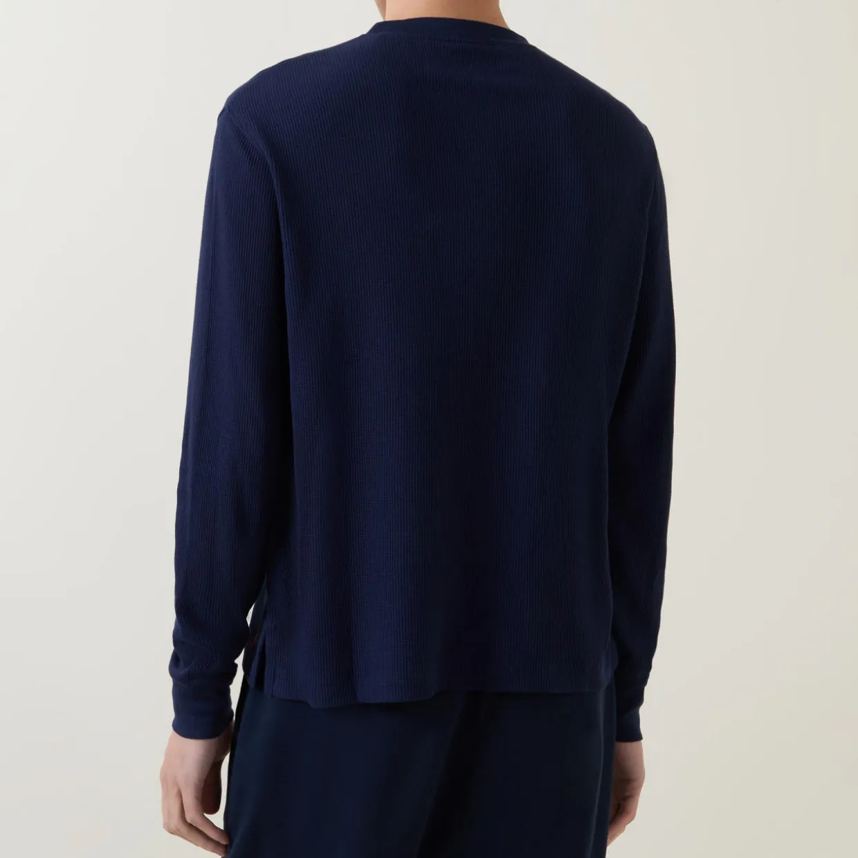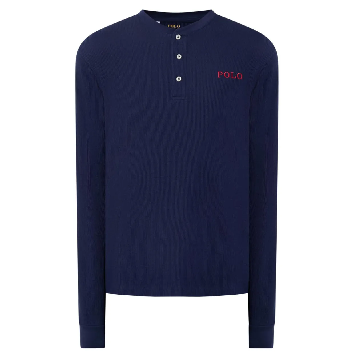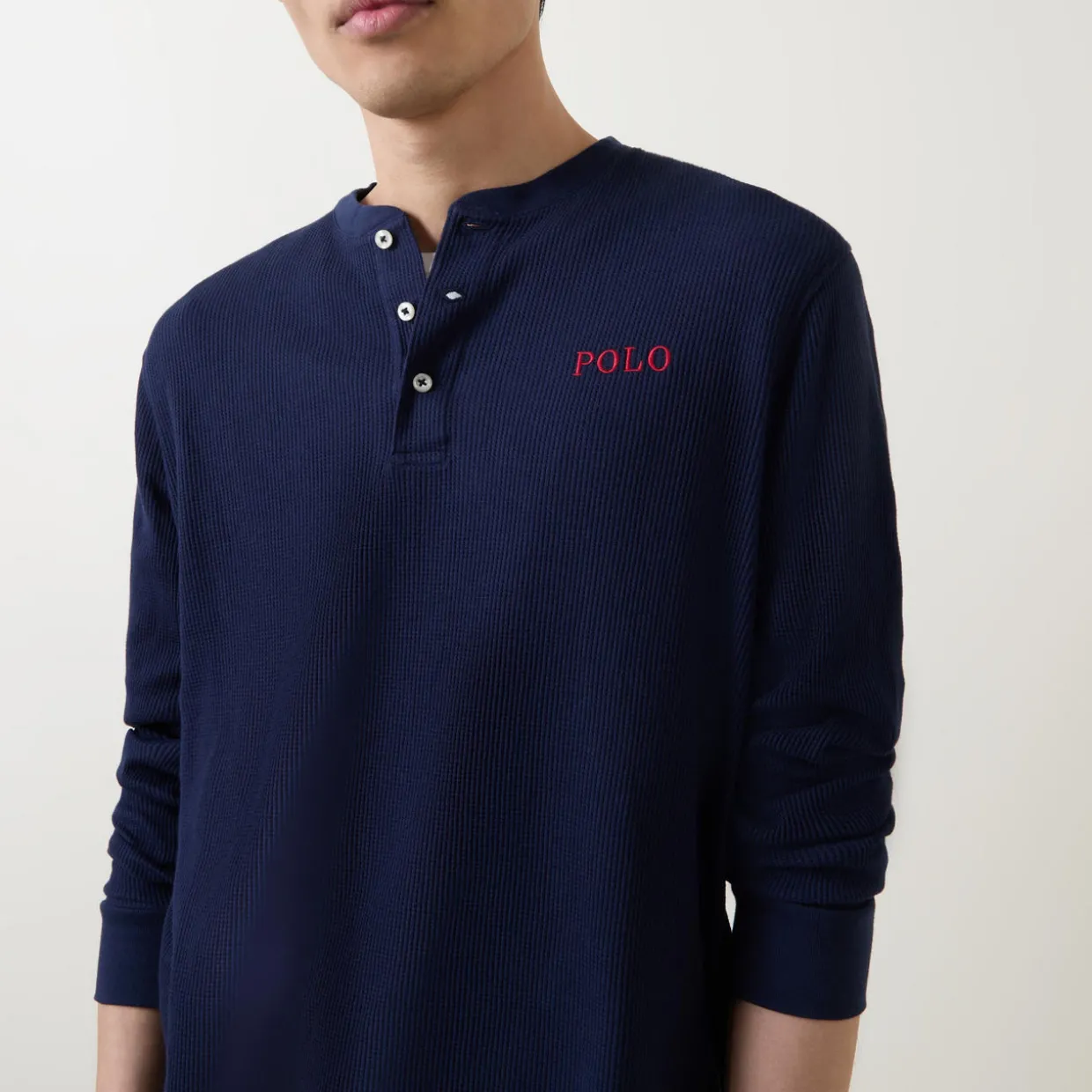 - Round neck, three-button placket, long sleeves, straight hem, embroidered logo detail, smooth finish