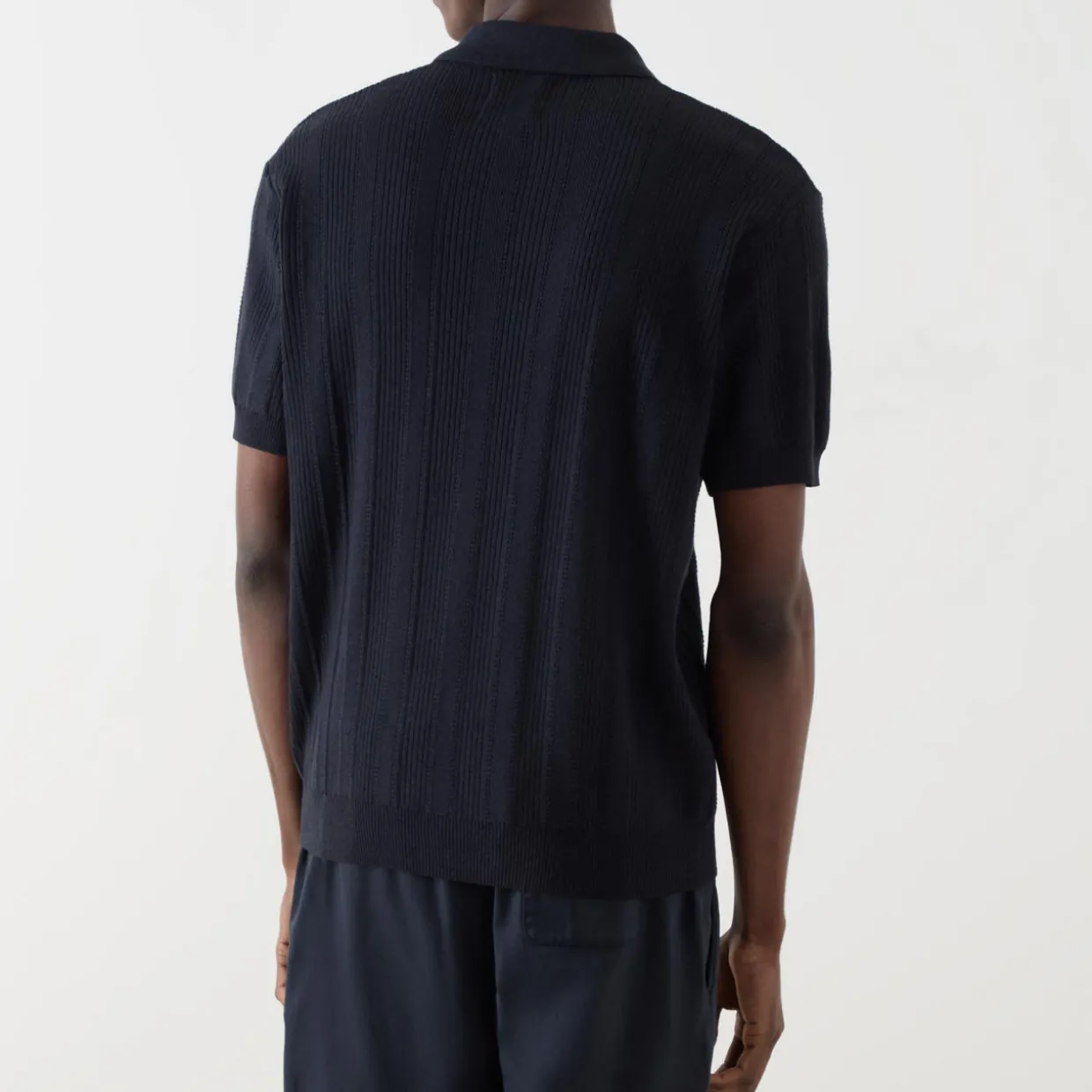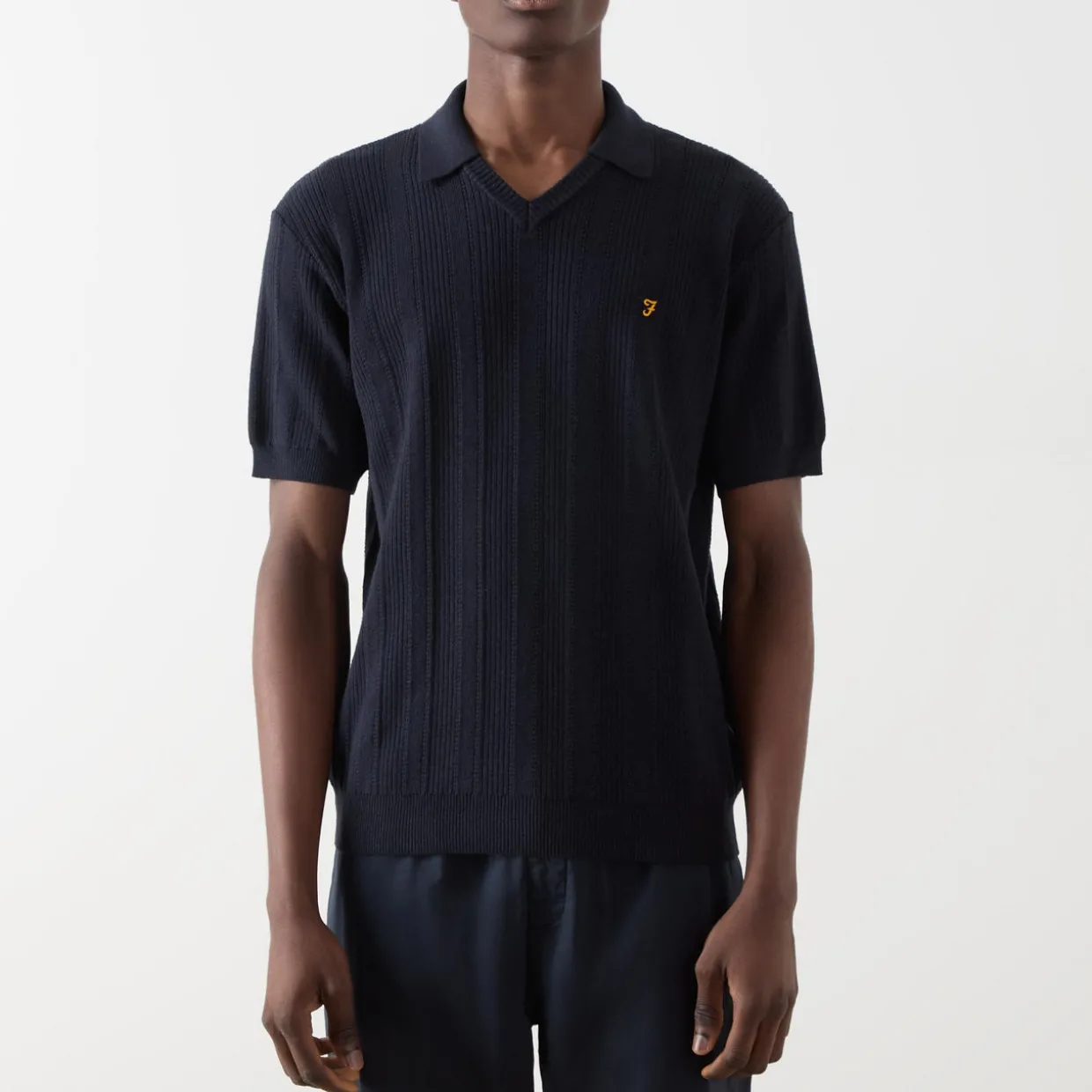 - Open placket, short sleeves, ribbed trims, logo detail, ribbed knit