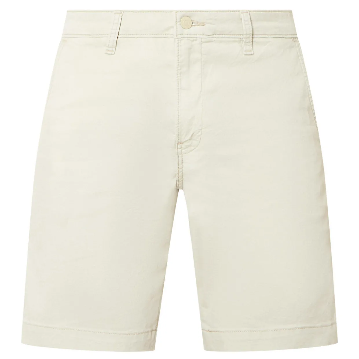 - Lightweight twill fabrication, added stretch, tapered silhouette, above-the-knee length, button and zip fly, two slanted side pockets, two welt back pockets, signature red logo tab