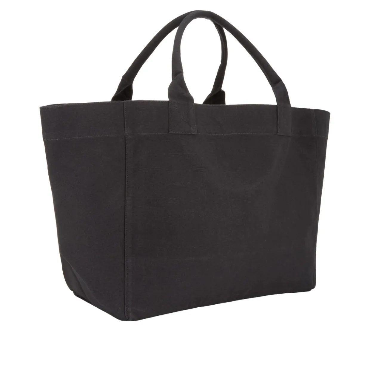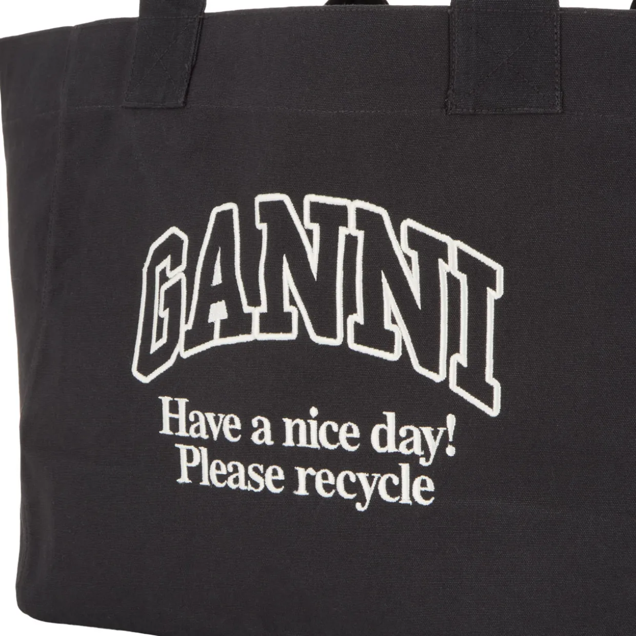 - Open top, top carry handles, boxy silhouette, embroidered logo and slogan detail to the front