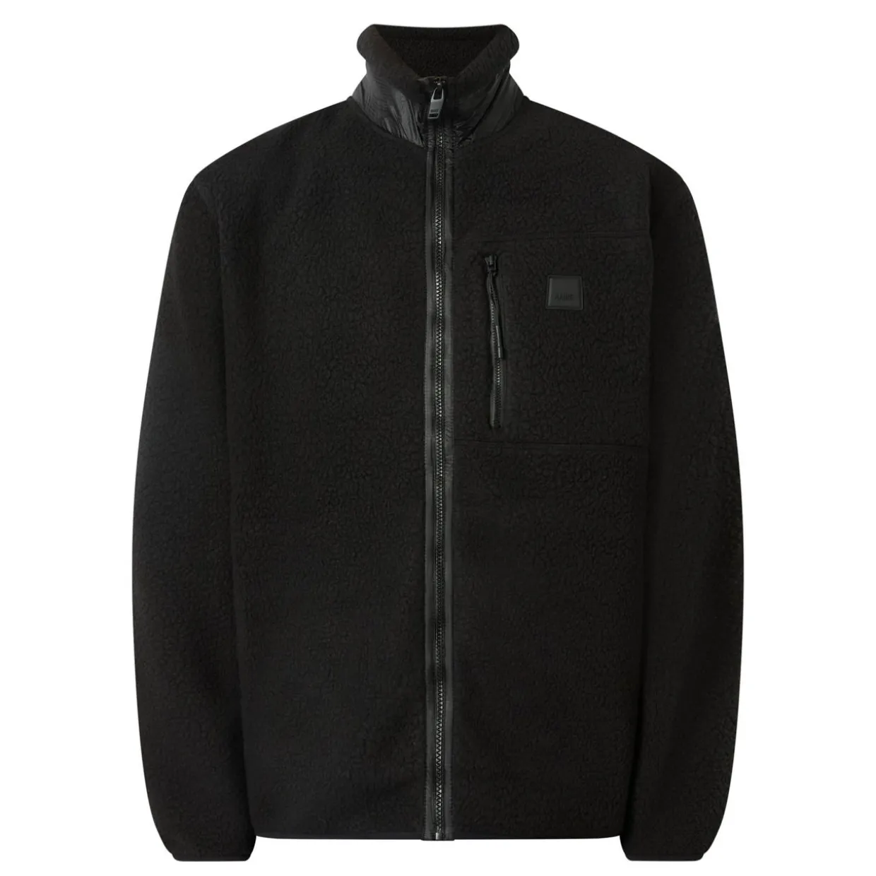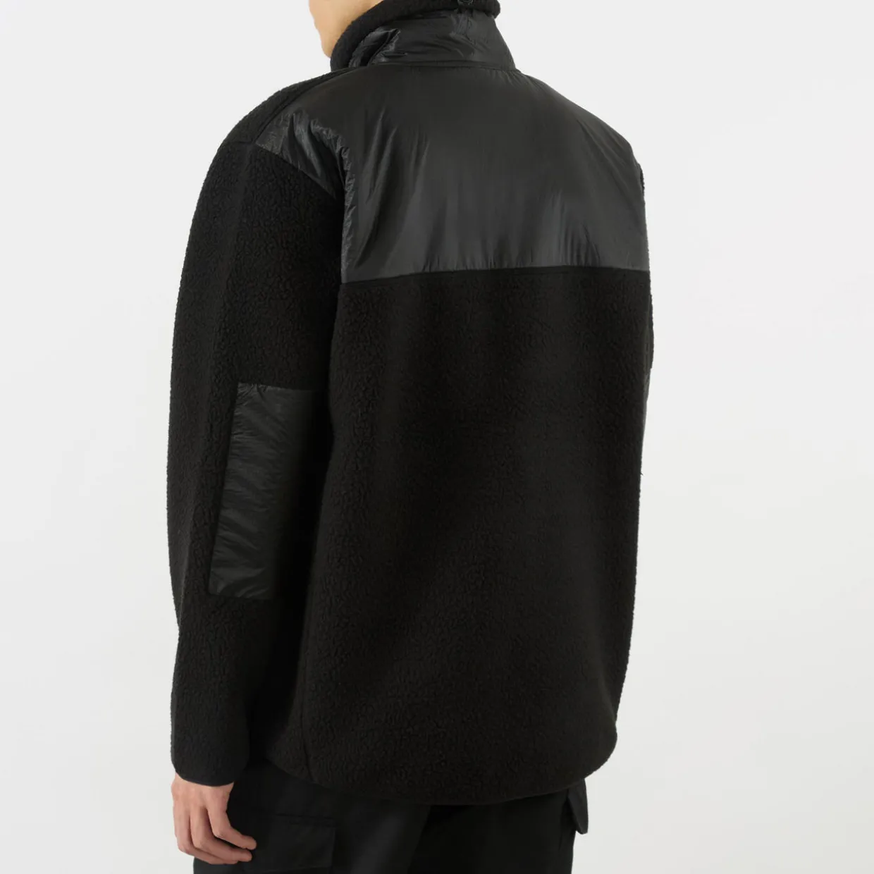 - Stand collar, dropped shoulders, long sleeves, front zip fastening, one chest pocket with vertical zip fastening, two side entry pockets, straight hem, bound trims, heavyweight fleece design, ripstop panel detailing, logo badge