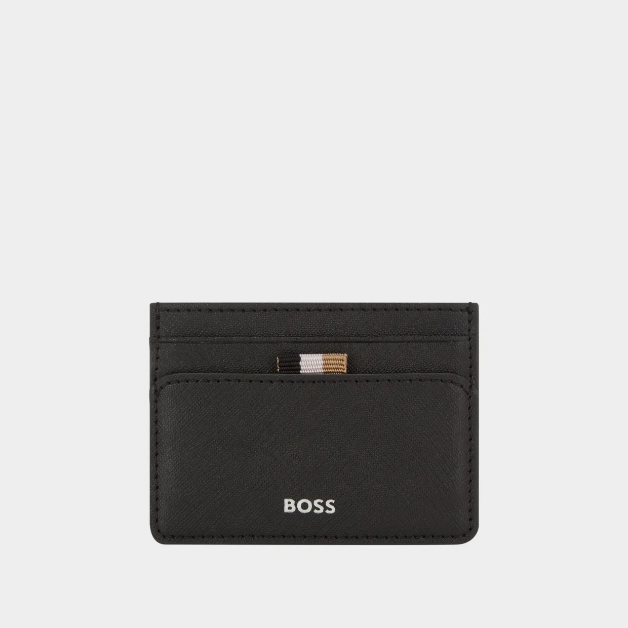 - Four card slots, front logo branding, logo flag tag, tonal stitching, crosshatch leather finish