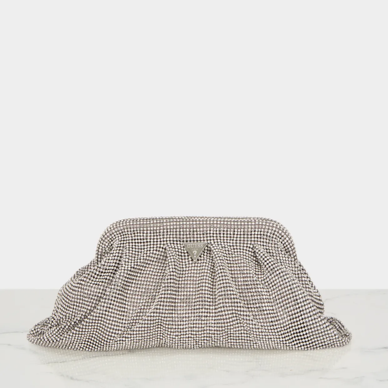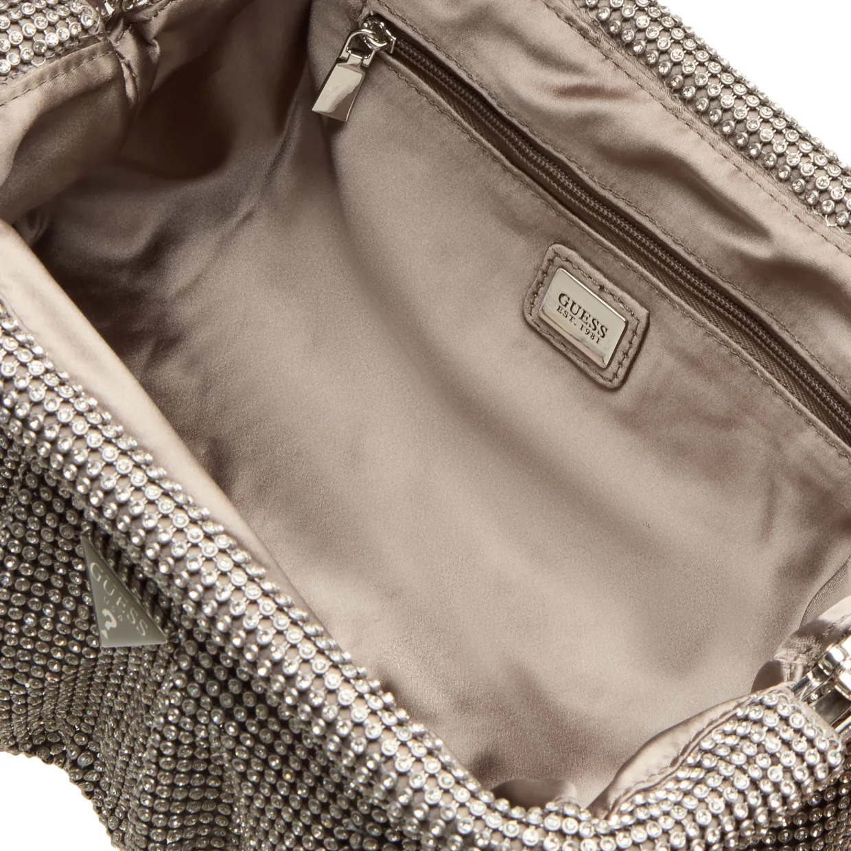 - Chain strap, hinge clasp fastening, signature triangle logo plaque to the front, slouchy shape, rhinestone mesh outer