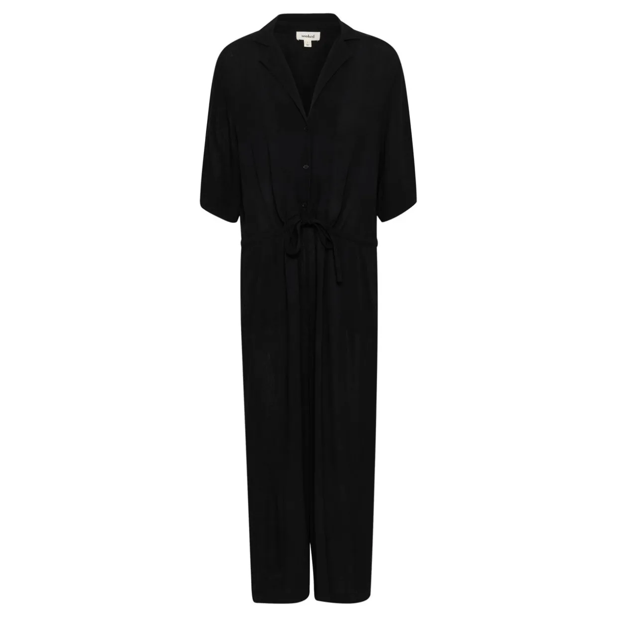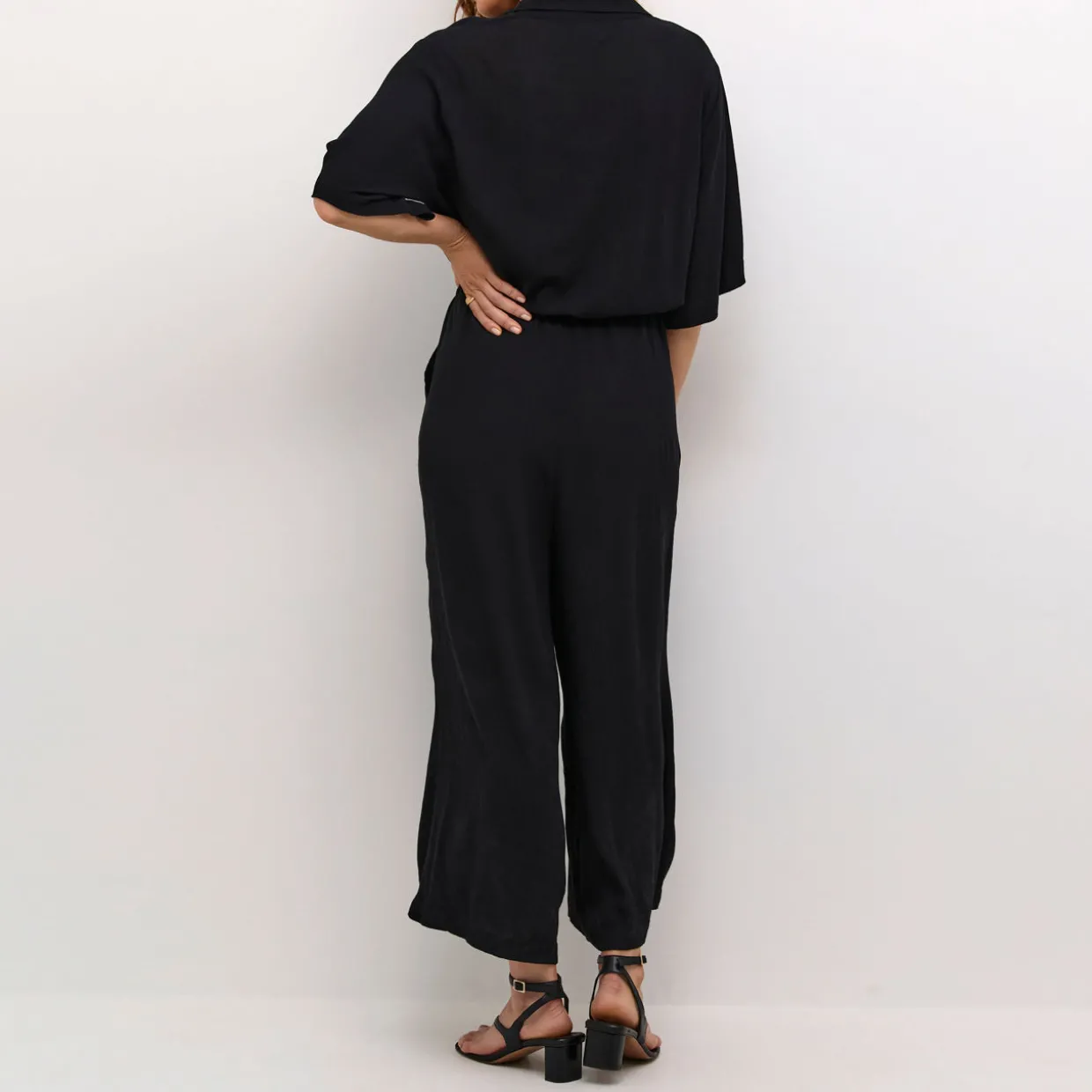 - Notched lapels, half-button fastening, self-tie drawstring at waist, wide-cut short sleeves, side entry pockets, wide-cut legs, smooth fabric