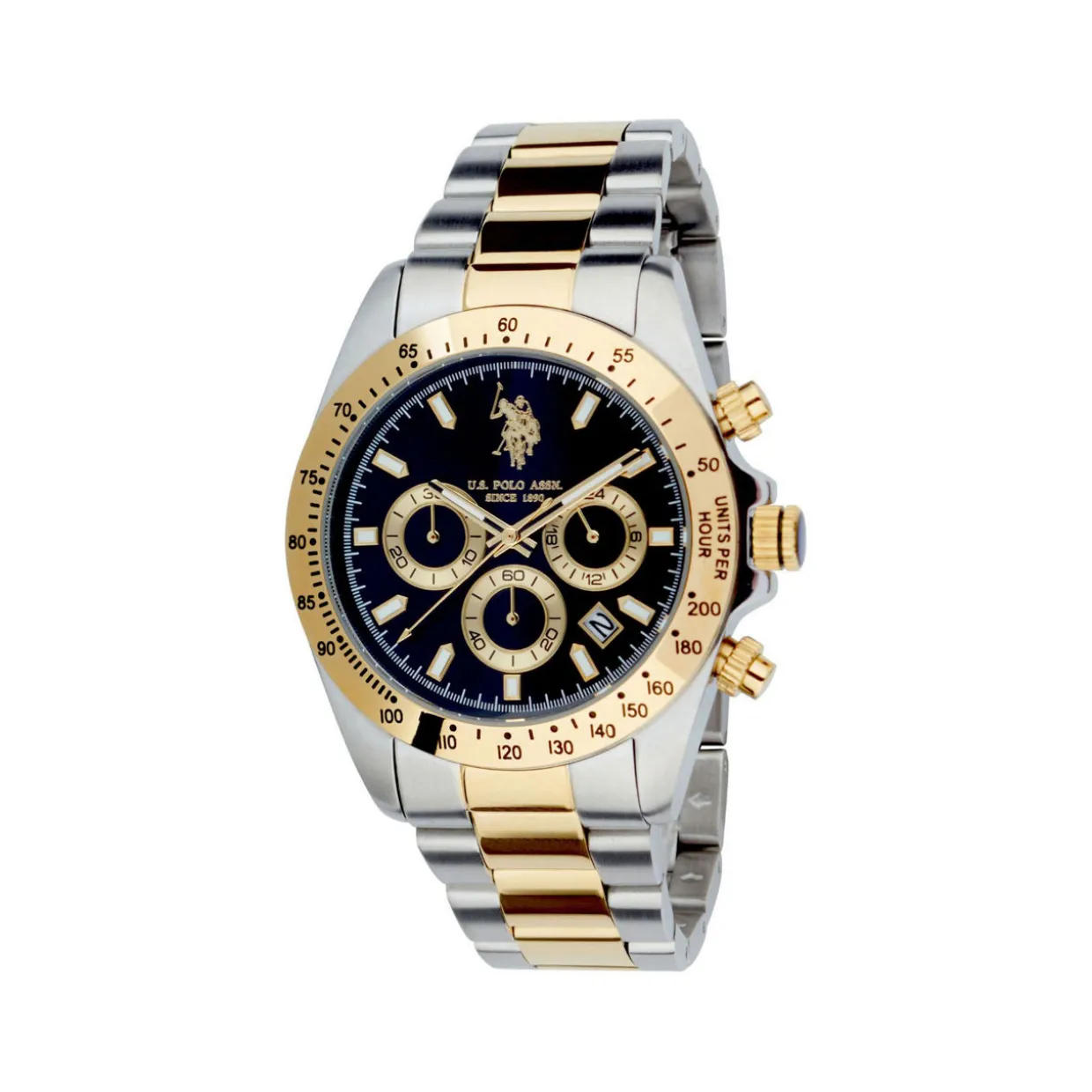 - Chronograph movement type, round case shape, 5 ATM water resistance