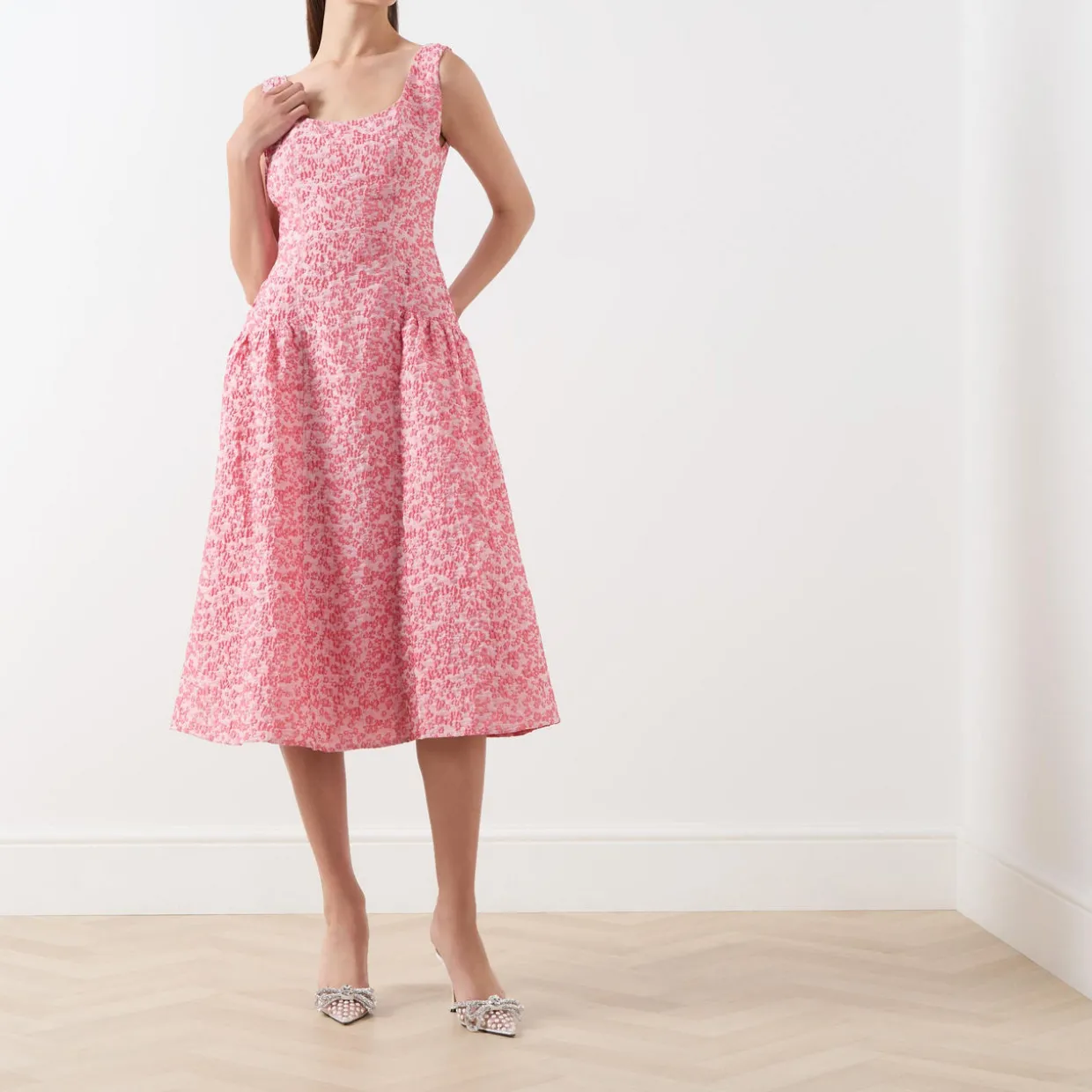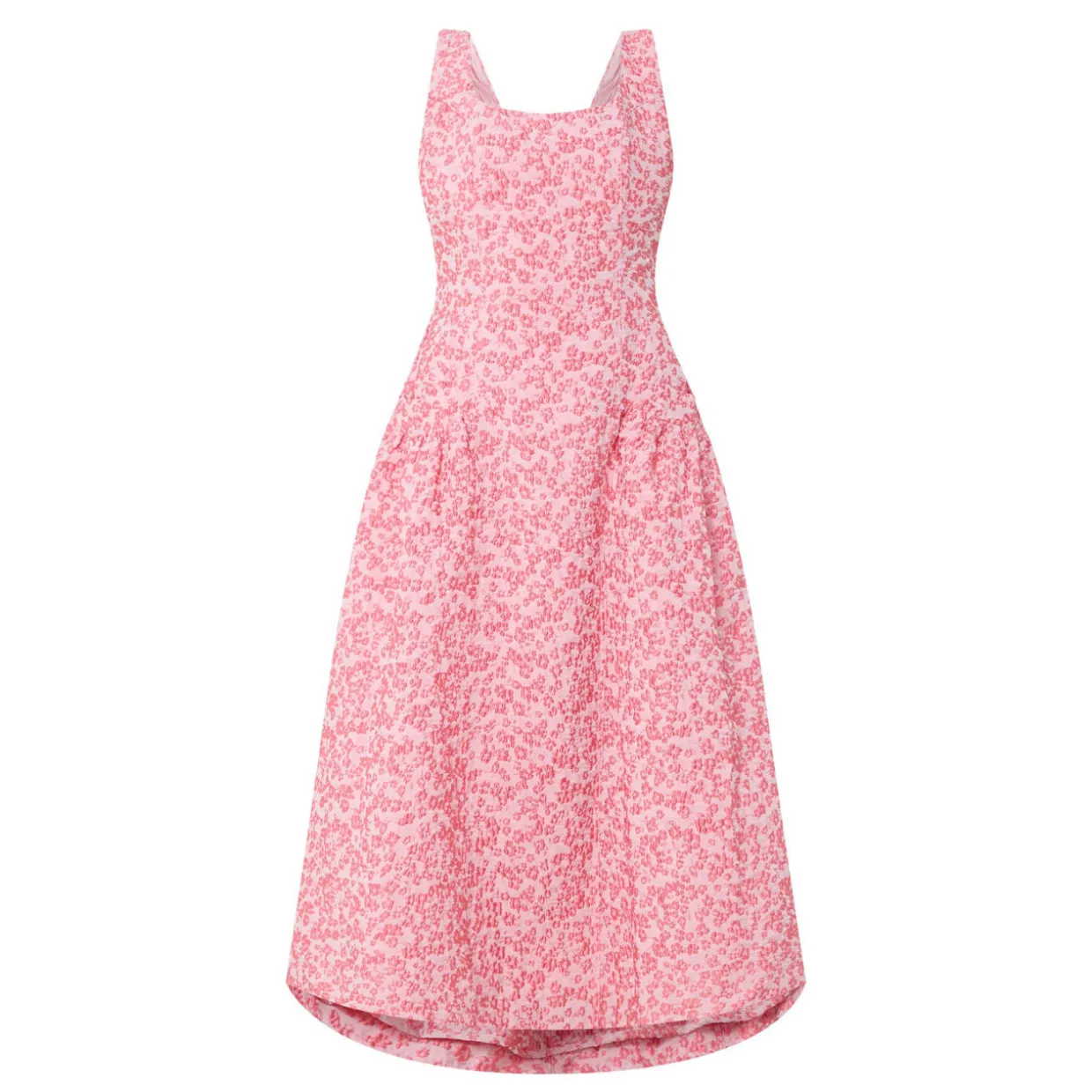 - Sleeveless, wide straps, scoop neckline, low U-shape back, rear zip-fastening closure, floral design, flared silhouette, midi length