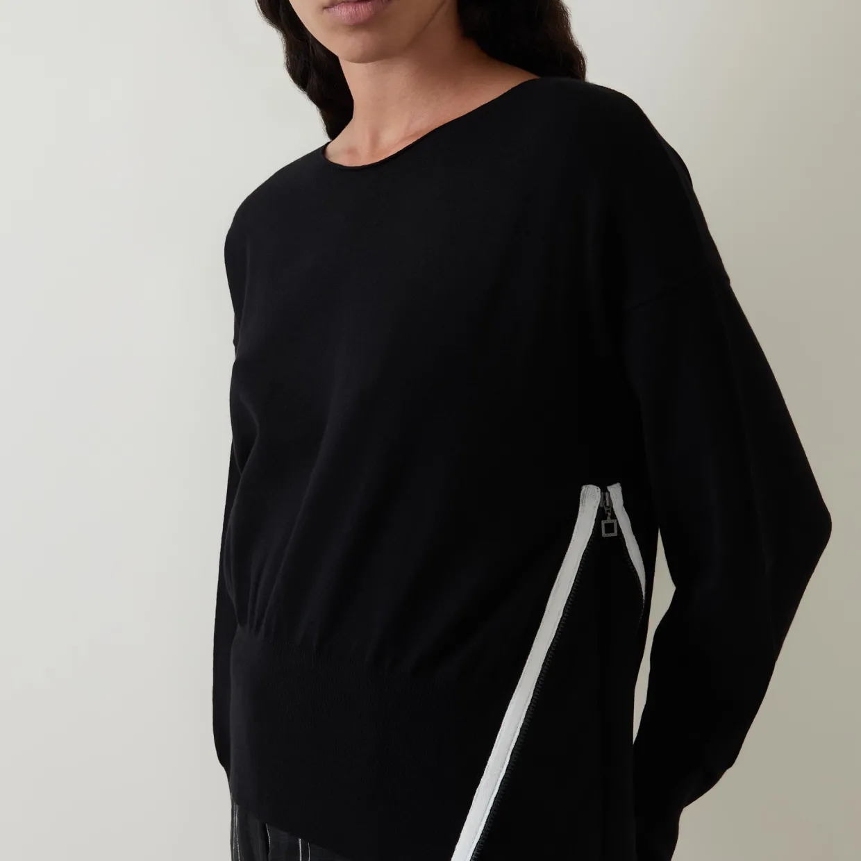 - Round neckline, long sleeves, fitted hemline, ribbed trims, zip detailing to the side