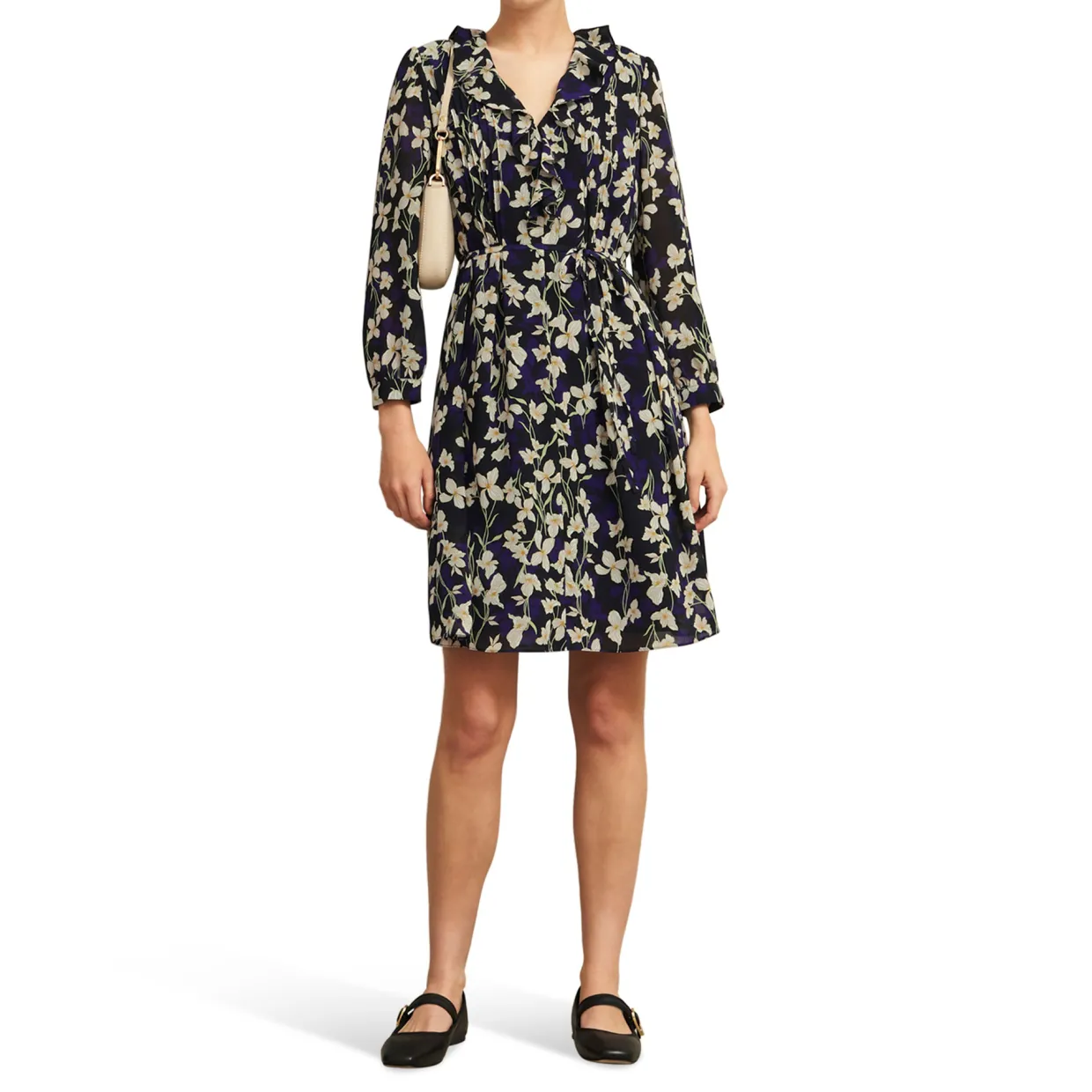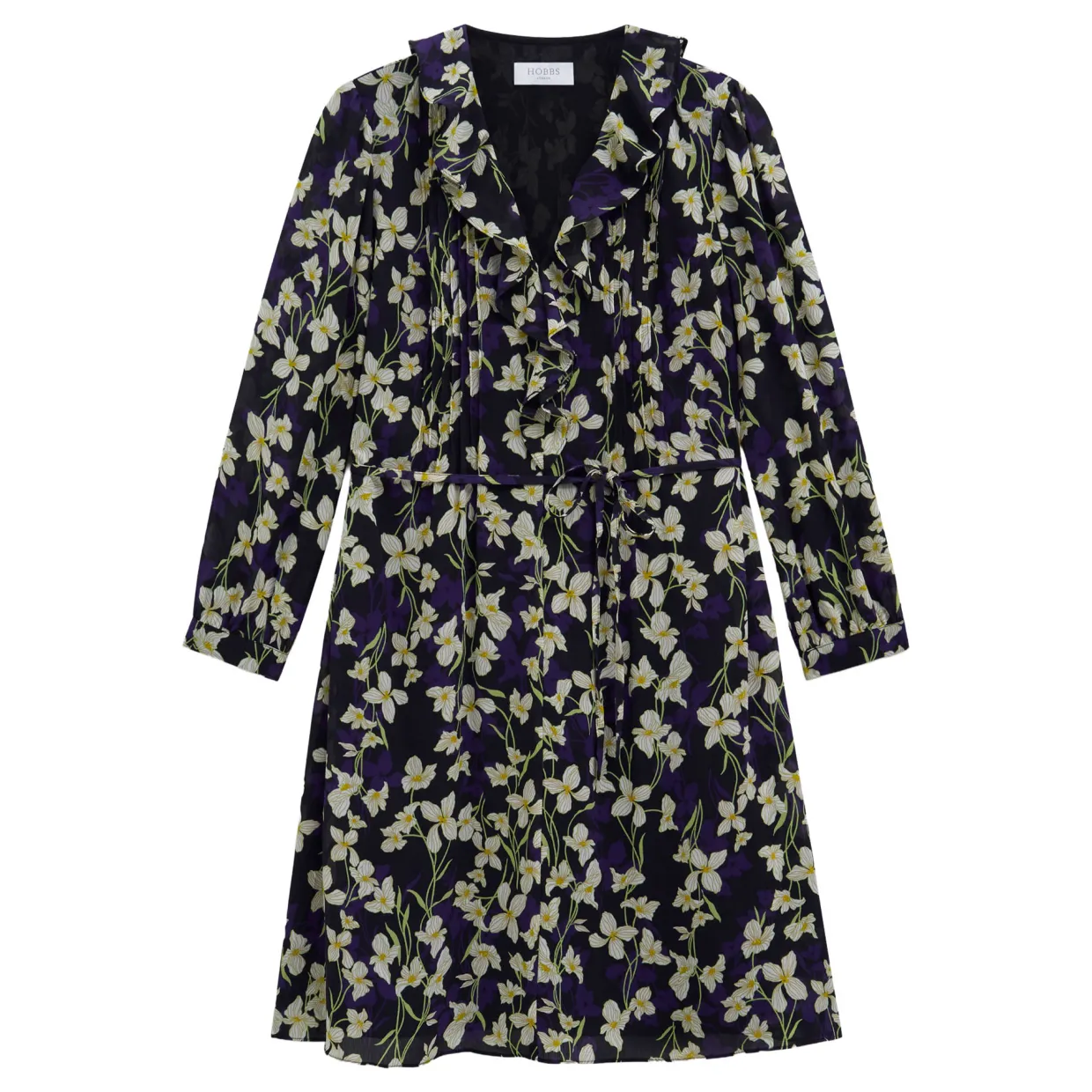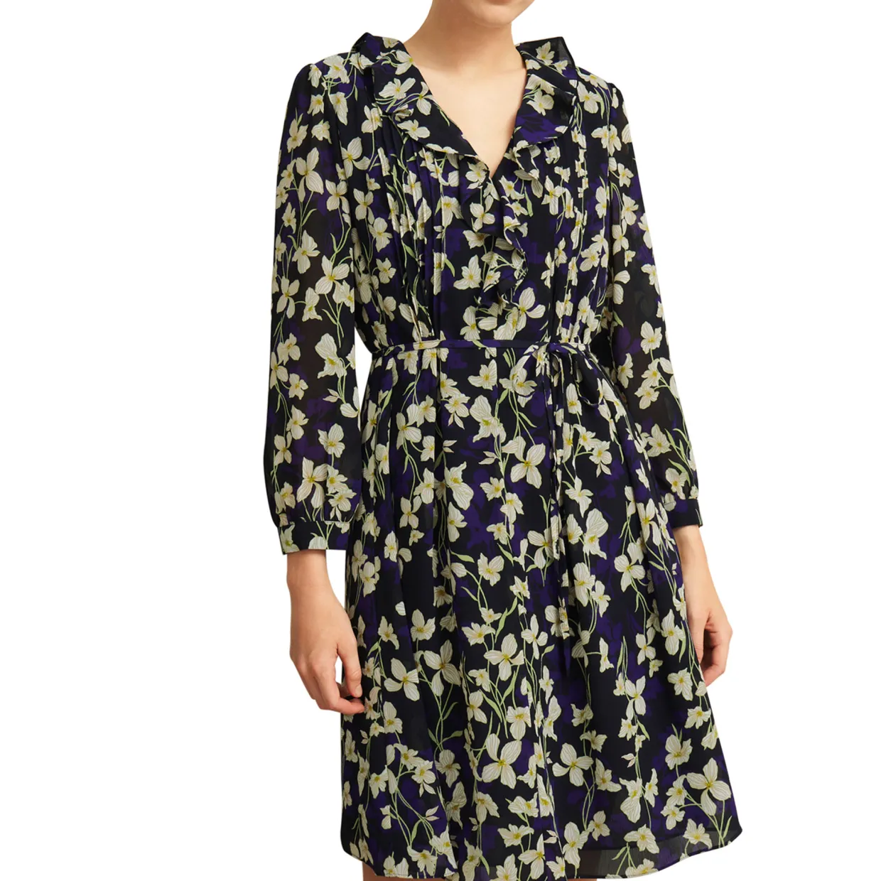 - Textured crinkle fabric, lined through the bodice and skirt, ruffle trim and pin tuck detail, tie waist, semi sheer blouson sleeves, V-neckline, floral print